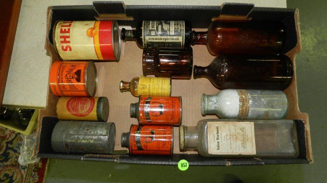 box of Primitive items including, advertising tins and bottles