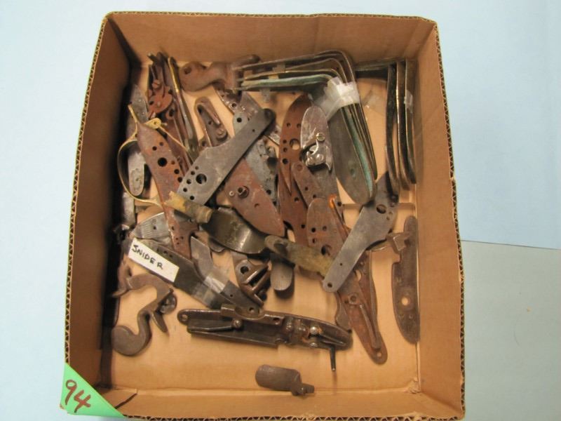 box of Snyder butt plates cap and ball plates and miscellaneous parts