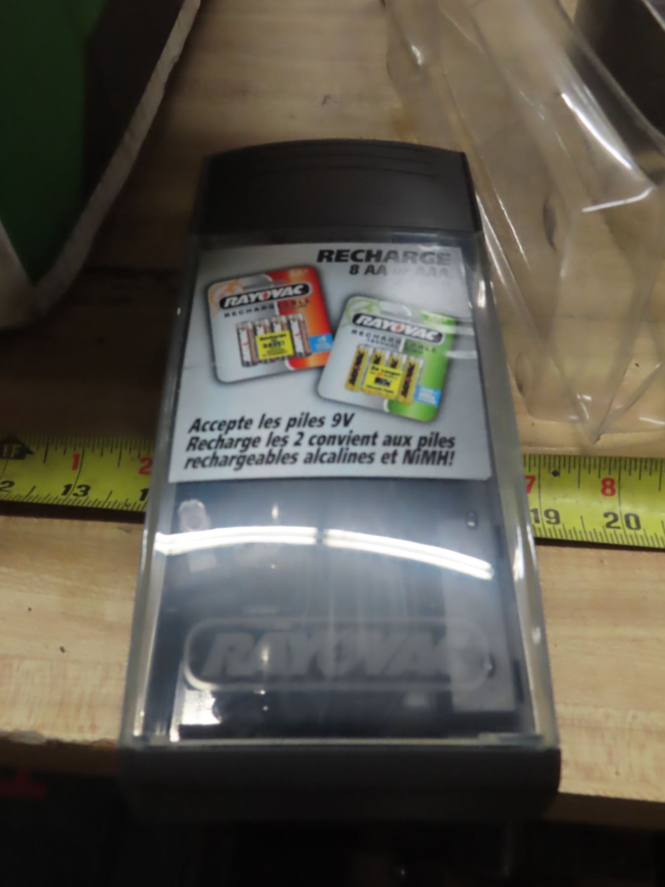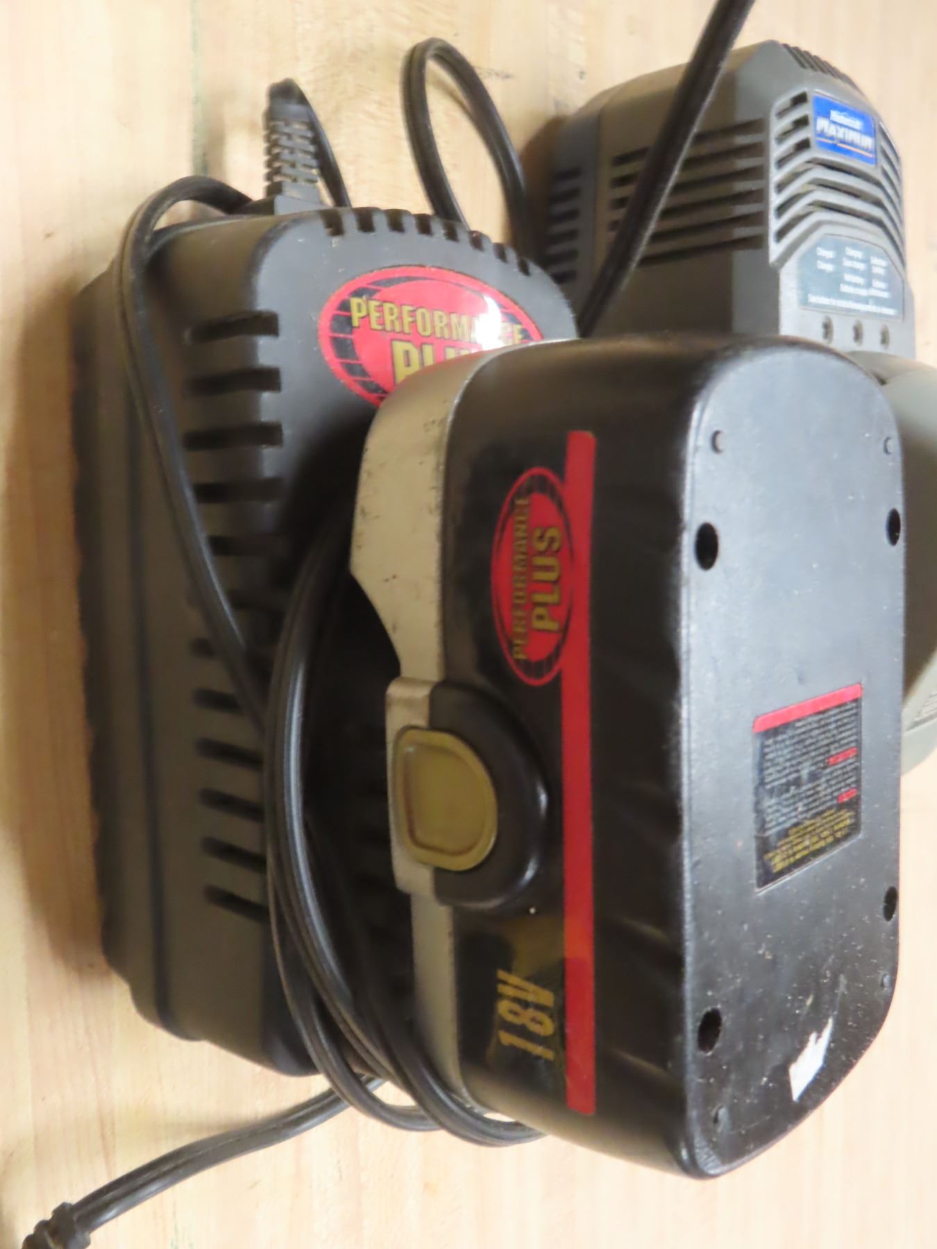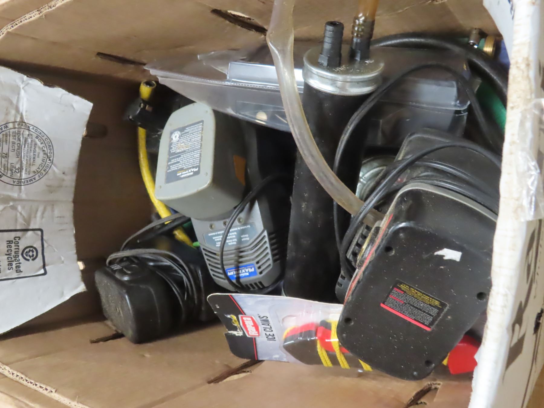 box of assorted batteries and chargers