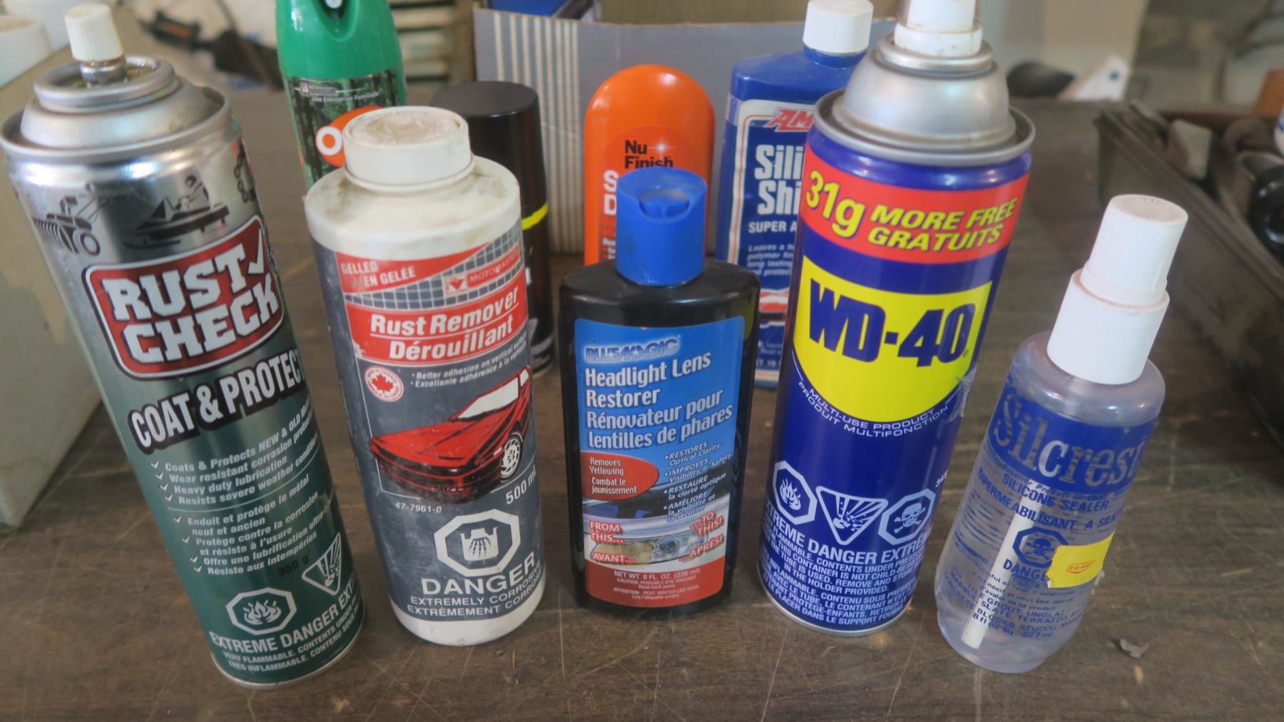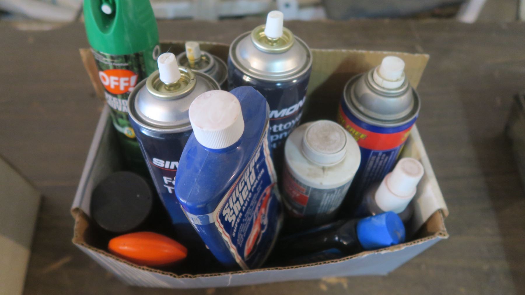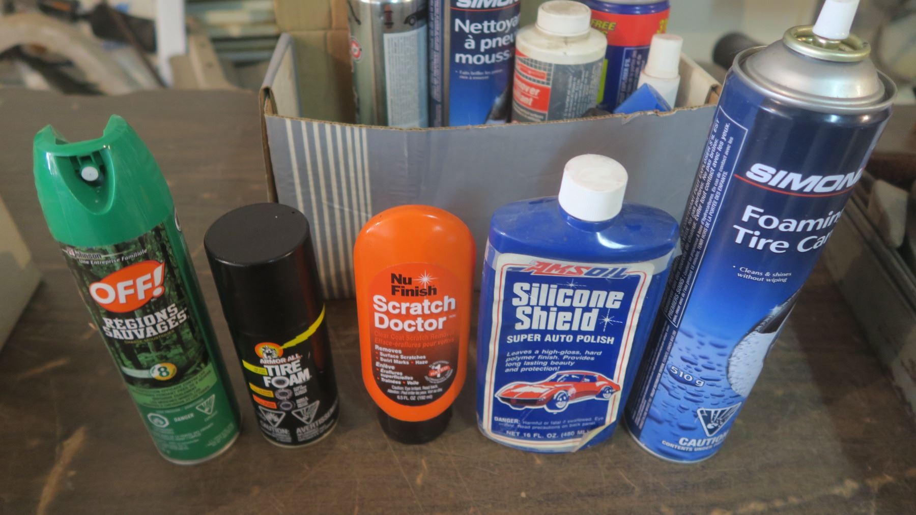 box of tire cleaner, headlight cleaner, auto polish, etc.