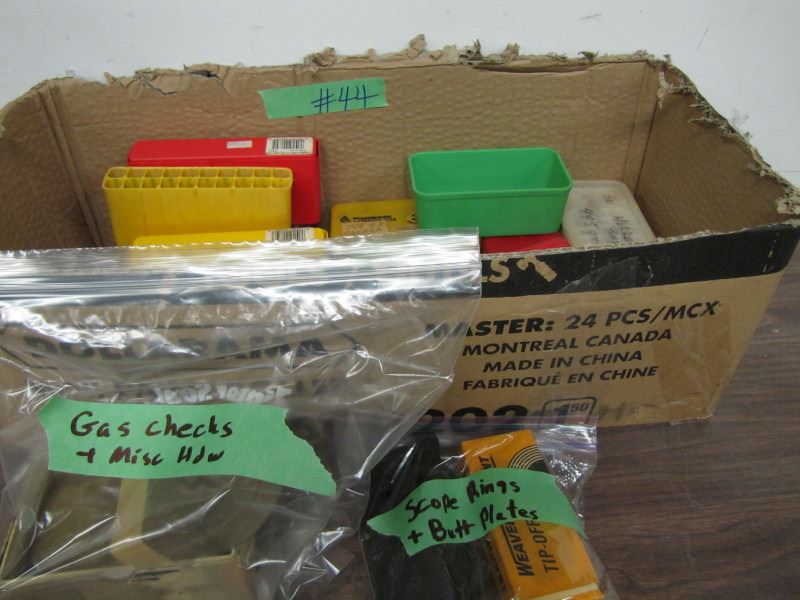 box with empty ammo boxes gas checks and miscellaneous hardware scope rings and butt plates