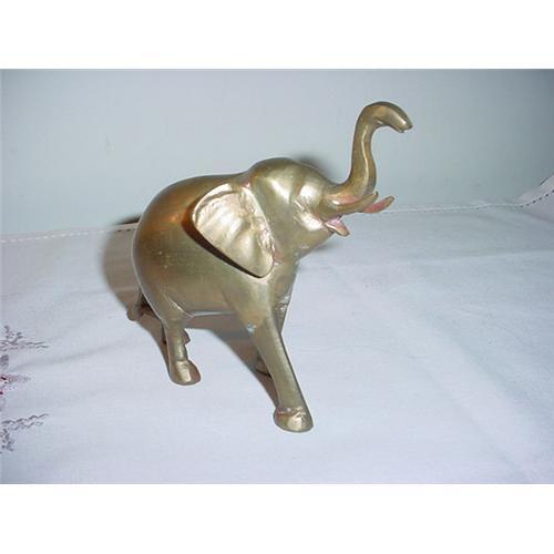 Brass elephant with an upraised trunk for "good luck". It is a nicely shaped mold and a popular size. A tiny blemish is on the upper left side.