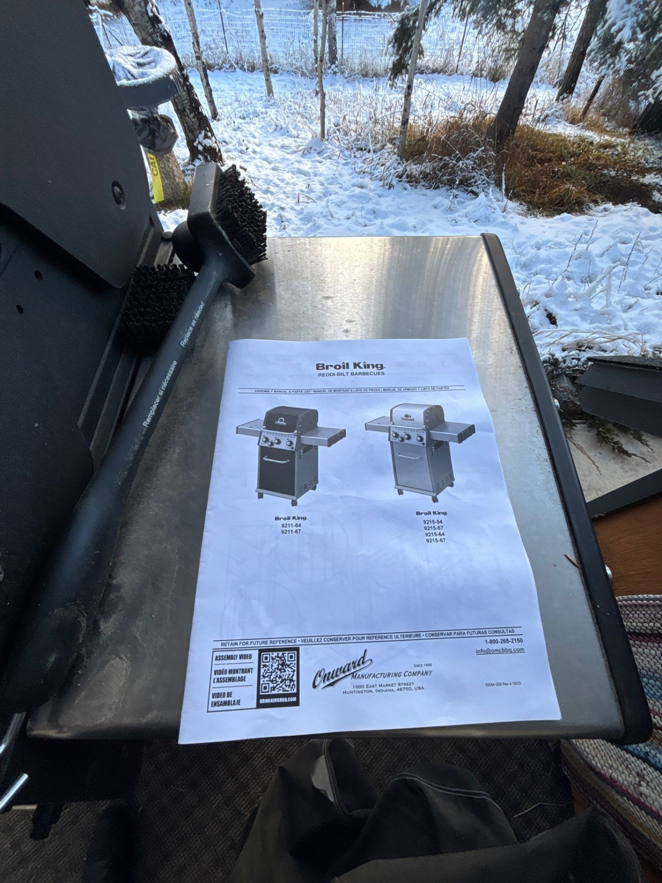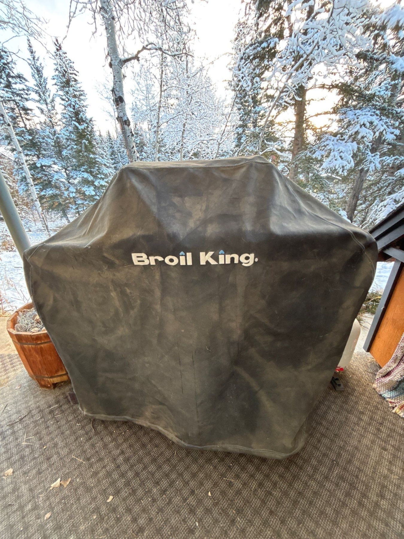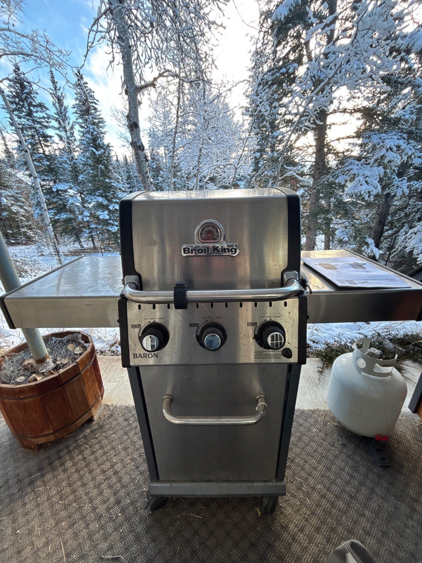 broil King Baron barbeque with original manual in great condition with high grade steel grates, two burners and a searing section with cover propane and includes barbeque tools