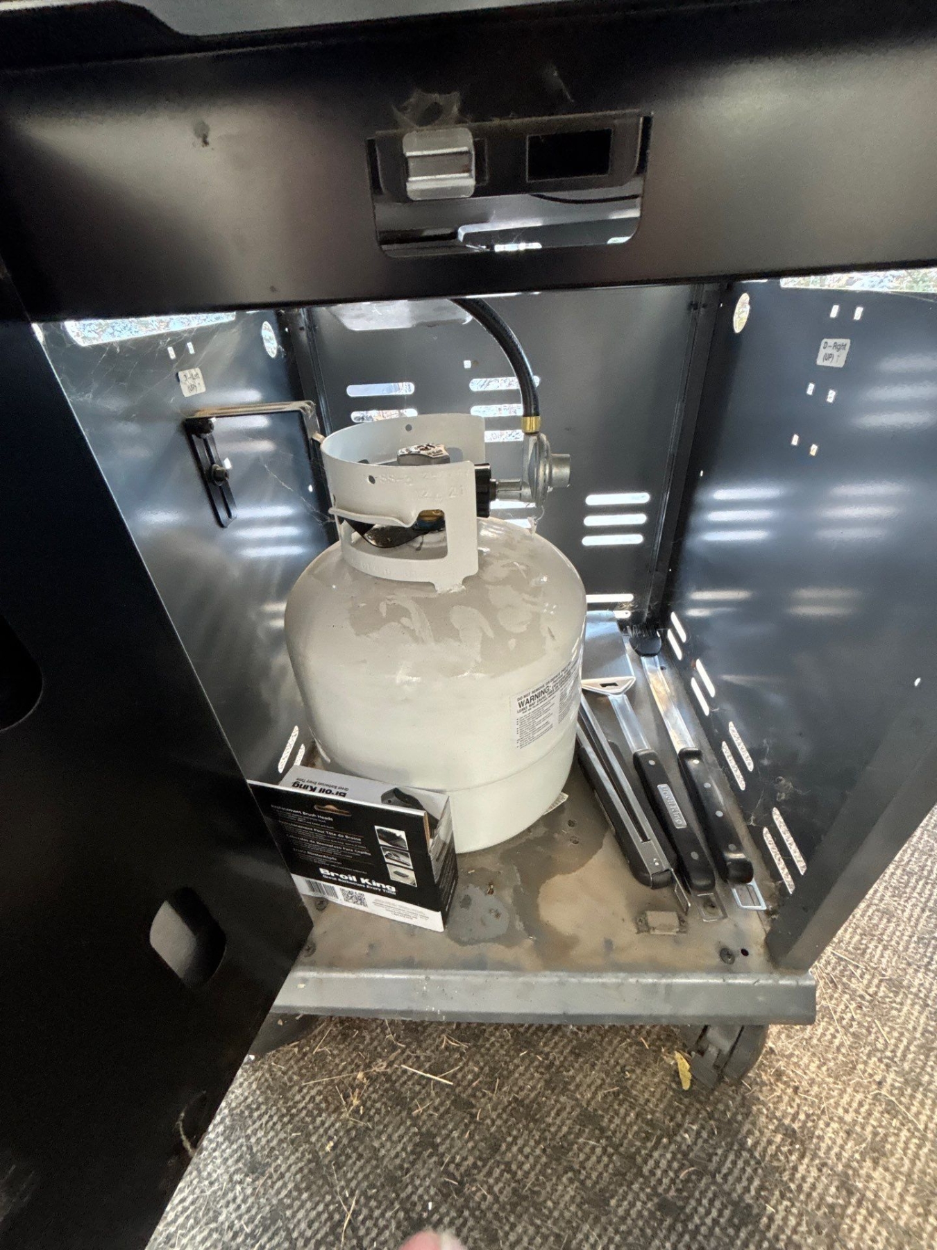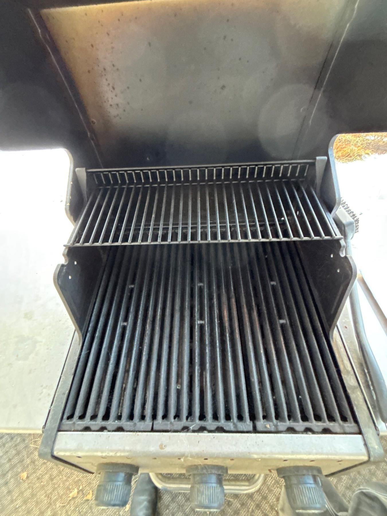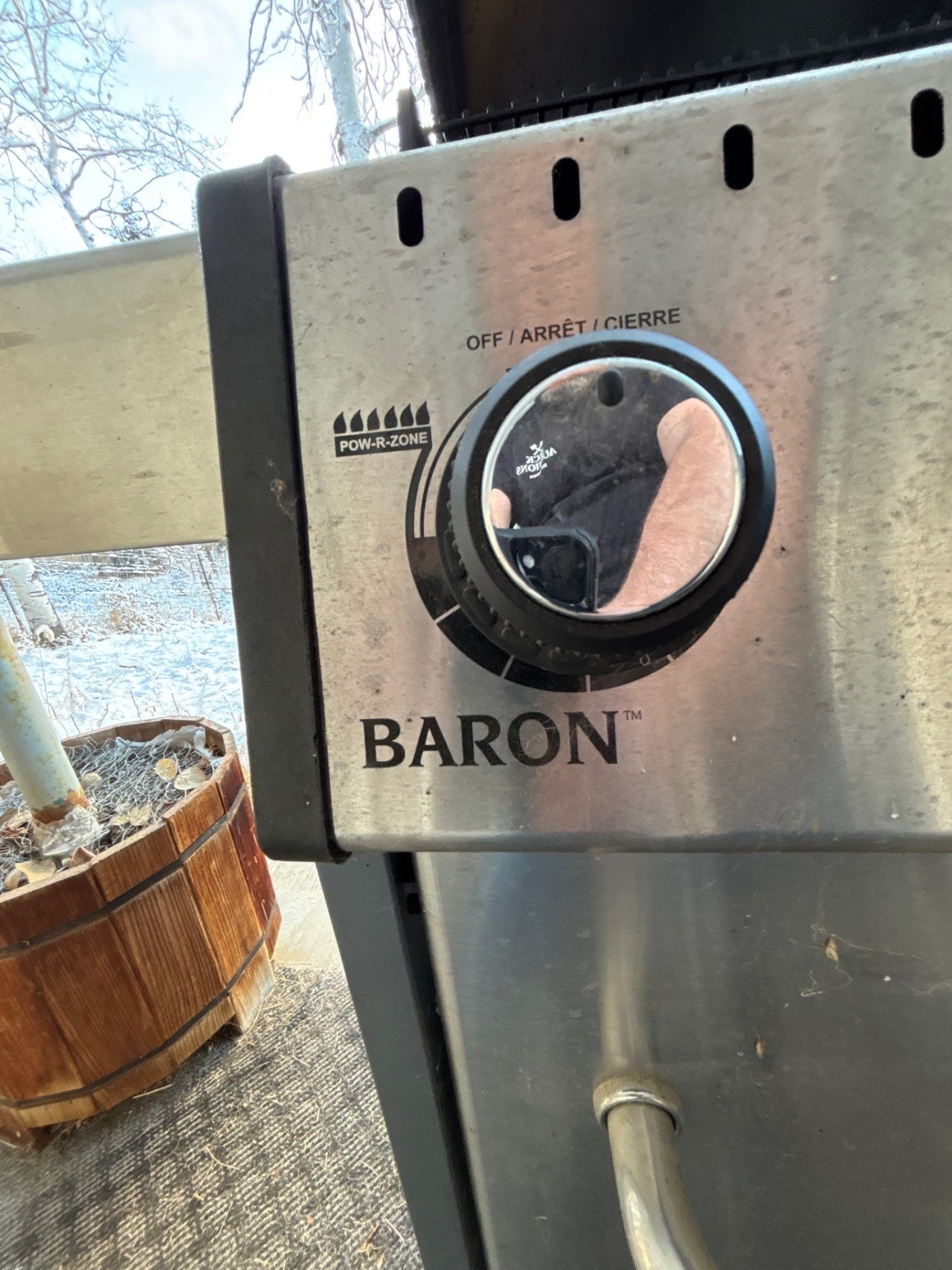 broil King Baron barbeque with original manual in great condition with high grade steel grates, two burners and a searing section with cover propane and includes barbeque tools