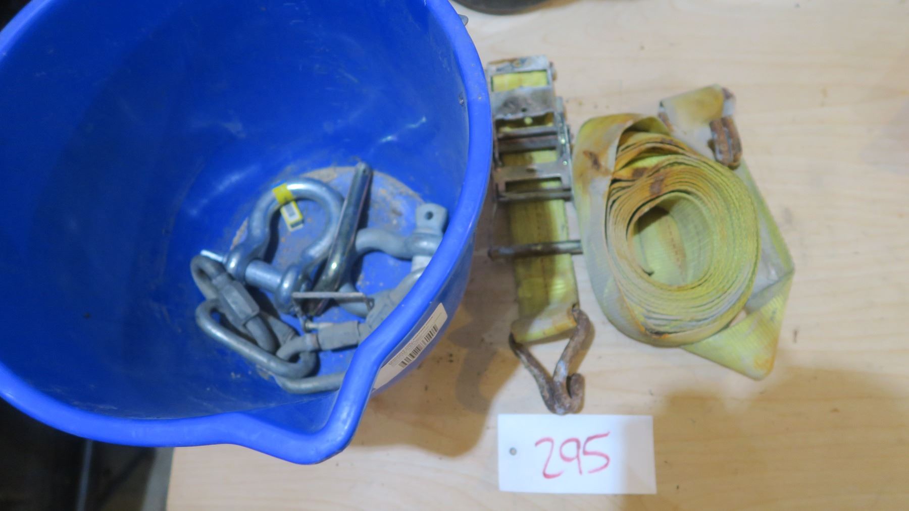 bucket with ratchet strap, shackles, hitch pins