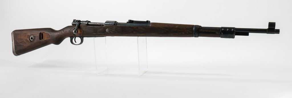 Mauser K98 bolt action rifle chambered in 8mm. The top of the receiver is marked "eagle/135/byf/44", the right side "eagle/135" and the left side with Nazi proof and serial number 29630. The left receiver wall is marked "Mod. 98", the rear of the barrel is marked with Nazi proof and "eagle/135". All visible numbers match. Late war stamped front barrel band, floor plate and trigger guard, ramped blade hooded front sight, tangent rear sight, slotted cleaning rod and laminated stock with matching handguard and cupped buttplate. The right rear and wrist of the stock are marked with eagle and proofmark. The barrel and receiver retain most of the original blue finish. The floorplate and trigger guard show some thinning. The rough finished, late war stock is in very nice condition with scattered light handling marks. There is a scratch on the left side of the stock that runs from the cross bolt to just befire the trigger. All metal markings are clear and the action functions as expected. C&R Eligible.