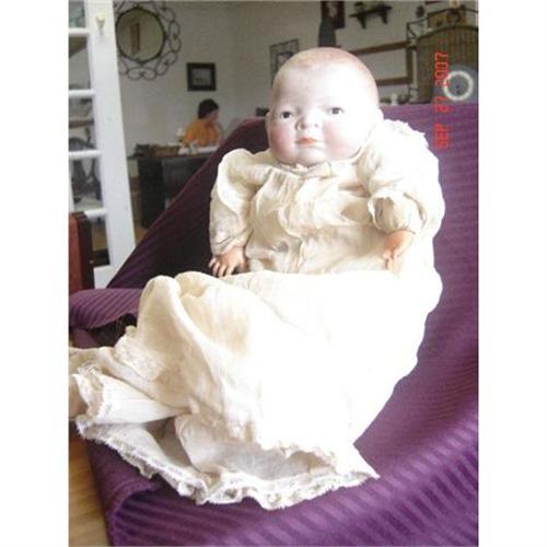 This is a very nice bye-lo designed by Grace Putnam and was manufactured by Alt, Beck & Gottschalck. Her bisque has no damage or repairs. The back of the babies head is signed Copr. by Grace S. Putnam, Made in Germany with the numbers 1373/43 underneath. Head circumference is 13" and she is approximately 14" long. I see a tiny paint smudge on her cheek. Her body is stamped in purple and is the "frog" type body. There is also a cryer box inside but it does not seem to work anymore. The clothing is original but is not in great shape. There is a tear at one arm and still has the original K&K tag on the dress. One hand is broken with the three fingers missing. The other hand is in good shape. Brown eyes are more rare than the blue. This would make a great addition to any doll collection.
