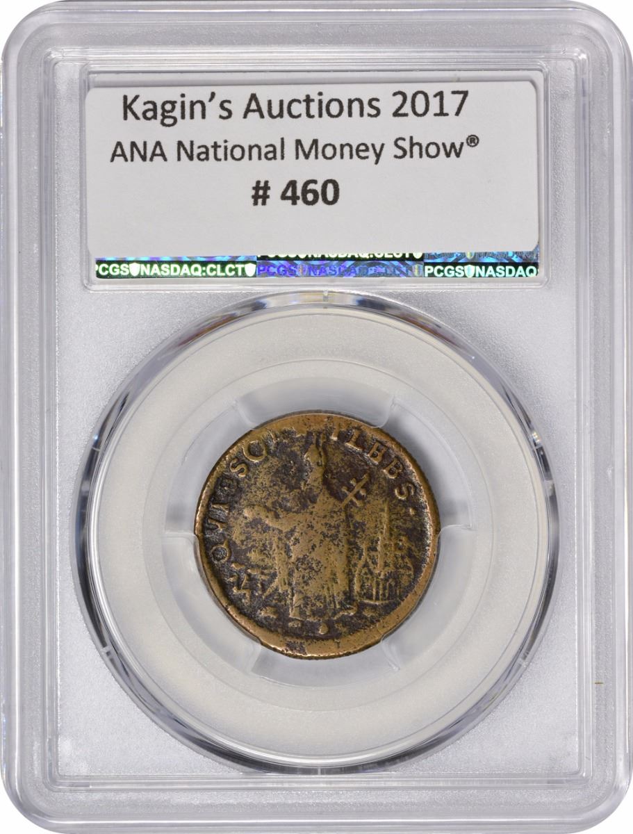 Normal wear for the grade, with light weakness seen on the body of St. Patrick. The distinctive brass splasher usually seen on the crown does not show, perhaps due to wear, loss, or toning.