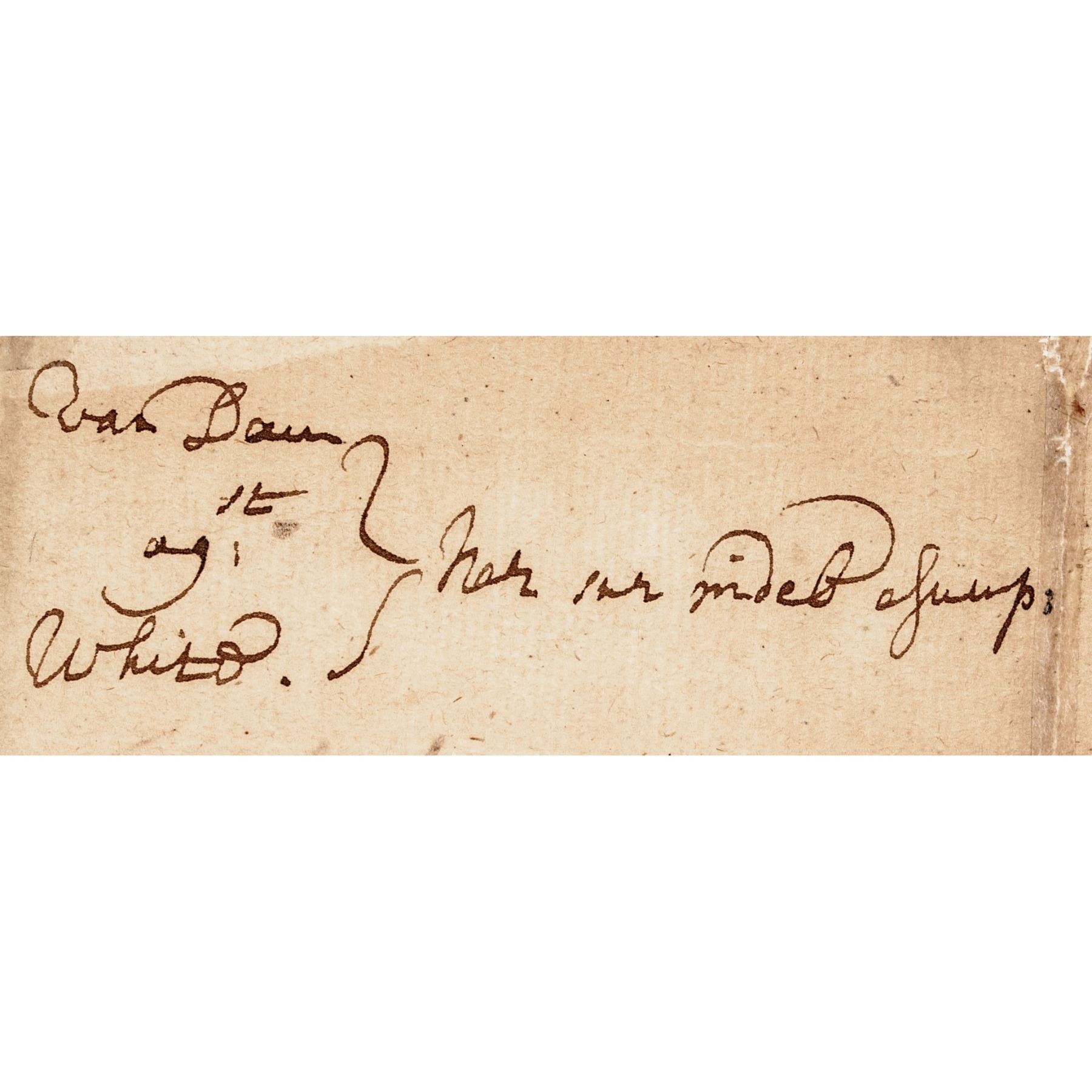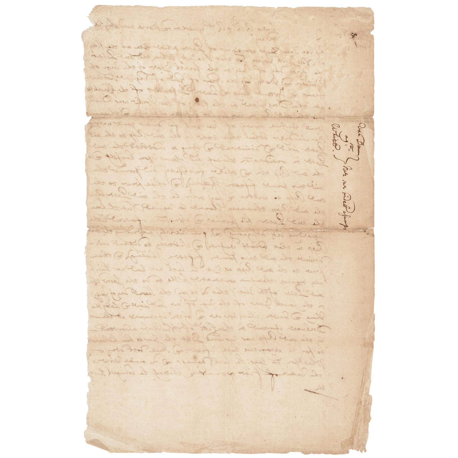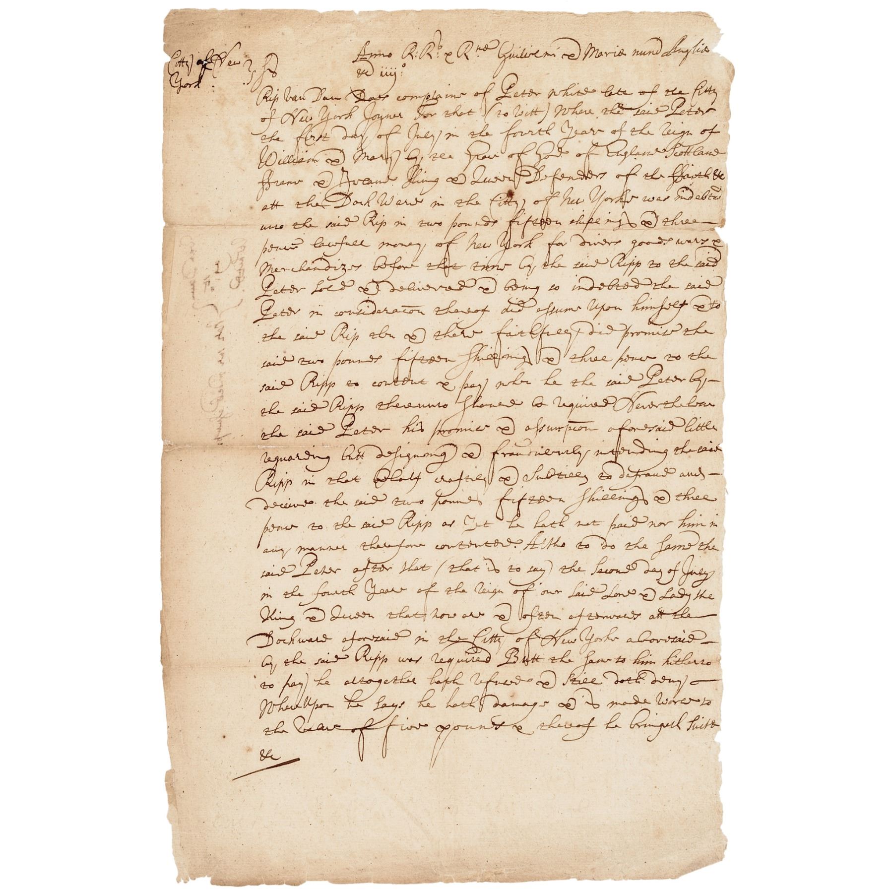 c. 1700 to 1720, Manuscript Legal Document written in brown ink on handmade laid period paper, not signed, no date, noted as “City of New York,” 1 page, measuring 12.25” x 8,” Very Fine. This early New York City document details a complaint between Van Dam and a Peter White, and reads in part: “Rip Van Dam ... complains of Peter White late of the City of New York ... Where the said Peter ... was indebted unto the said Rip [Van Dam] in two pounds fifteen shillings and three pence lawful money of New York for divers good wares & merchandise ...”. Based on the content, apparently White was to assume the debt and pay Van Dam, but refused, and so Van Dam brought a suit for five pounds. This Document is lightly toned with normal folds with some expertly sealed splits. Aside from some minor edge wear, this early Colonial document remains in nice readable condition.