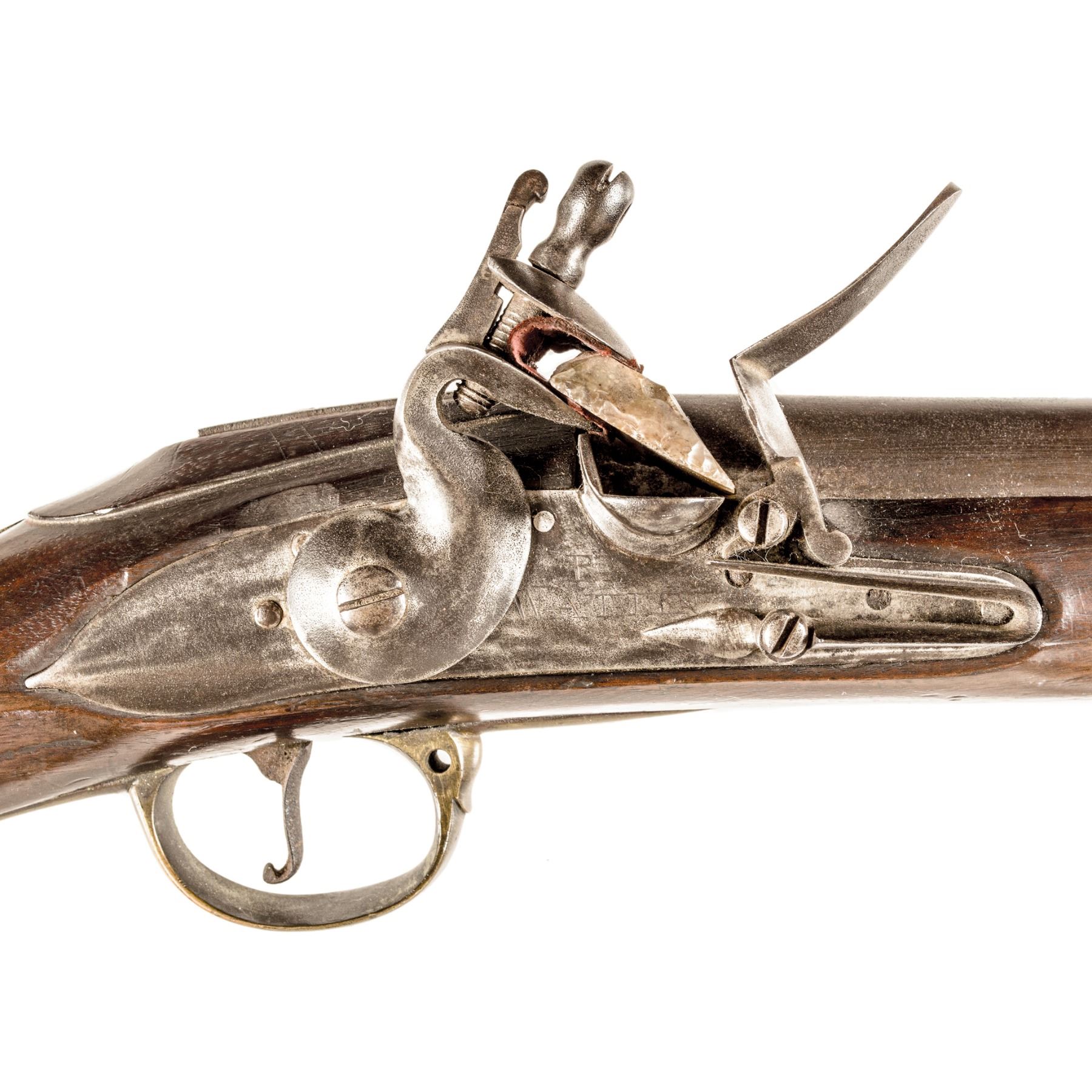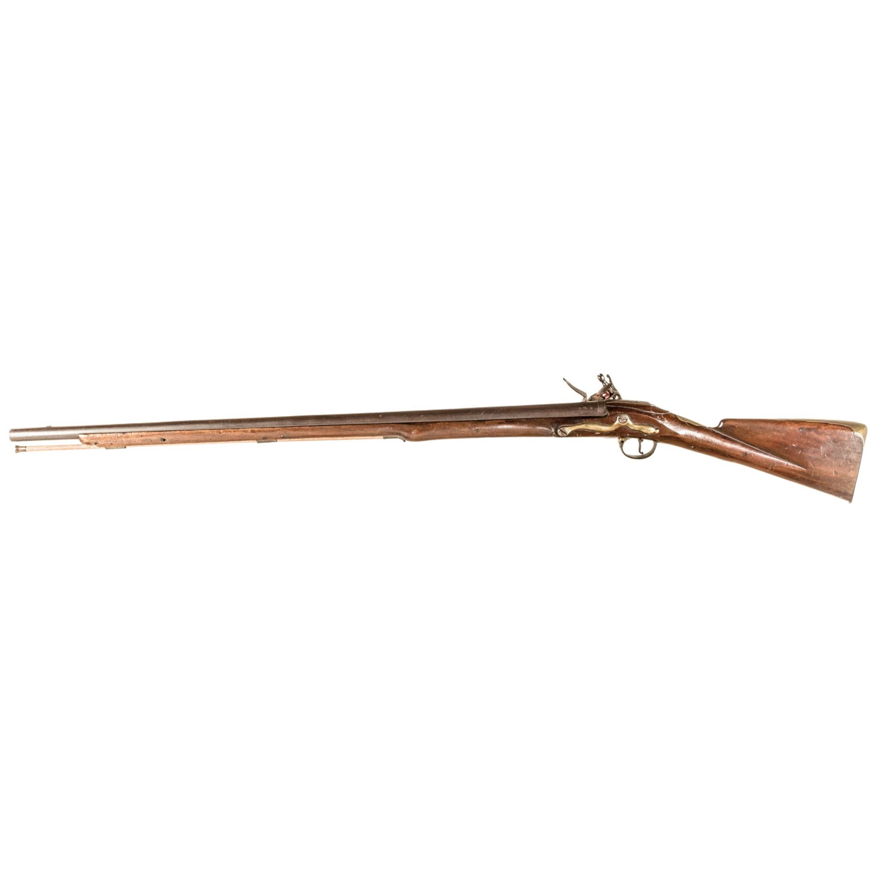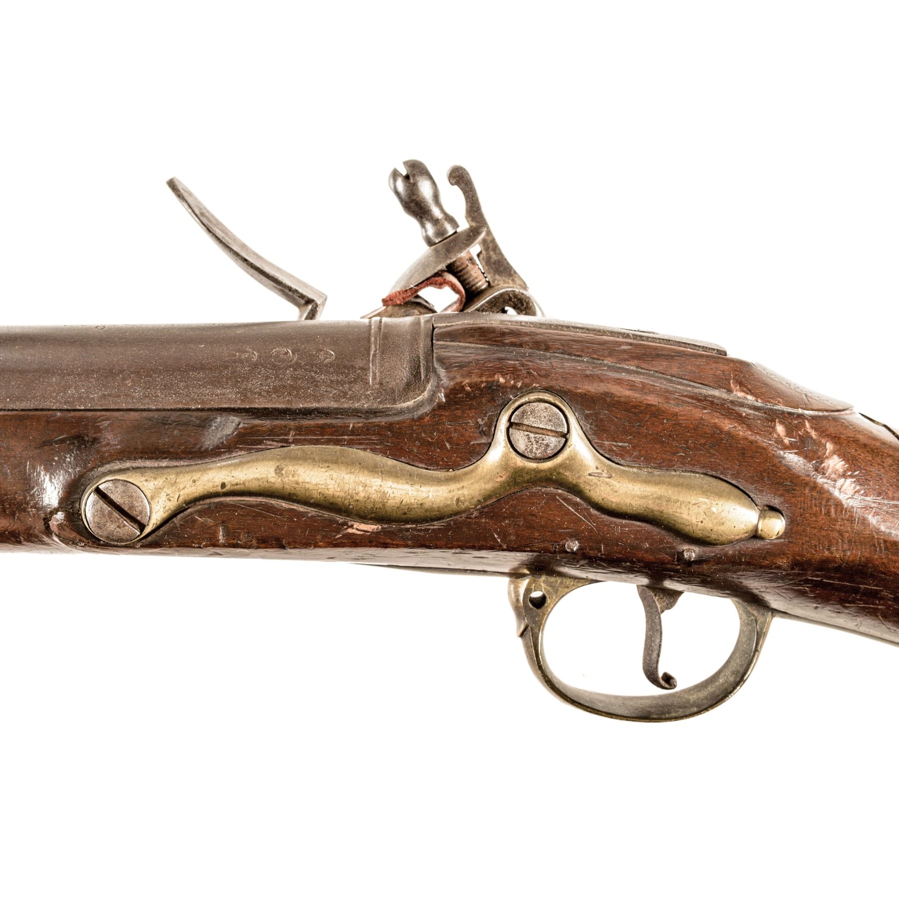 This British 1st Model Long Land Pattern Contract Brown Bess Flintlock Ship's Musket is in good mechanical working order. Measuring 54.5" in overall length. The majority of these Muskets started out with 46" barrels and over time were reduced in length because of how cumbersome they were when being used onboard their Royal Navy ships. An attractive Musket for display, this rare Colonial America, French and Indian War to Revolutionary War Period Use, Brown Bess Flintlock Ship's Musket was made by a Contractor to the Tower of London, having his maker-mark "R WATKIN". It has a 38", .75 caliber smoothbore round barrel has a nice deep natural patina. Struck with early private proofs on the top left side of the breech. Engraved "No. 11" on the top. British banana shaped lock, maker engraved "R WATKIN". Its all brass furniture includes a Pattern 1st Model Brown Bess side plate, butt plate, wrist escutcheon, ram rod pipes, plus a private pattern trigger guard which retains a pleasing yellow-brass patina. This Long Gun is in its original Flintlock configuration with an older replacement wood ramrod. Its classic form stock has a modest stress crack located on the underside on the left side of the trigger guard. Overall, a solid gun with its original varnish, having some expected light scratches and dings from years of actual use in service.