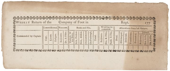 c. 1776 American Revolutionary War, Partially-Printed Document, “Weekly Return” Form, for an American Army Regimental Company of Foot, Very Fine.
