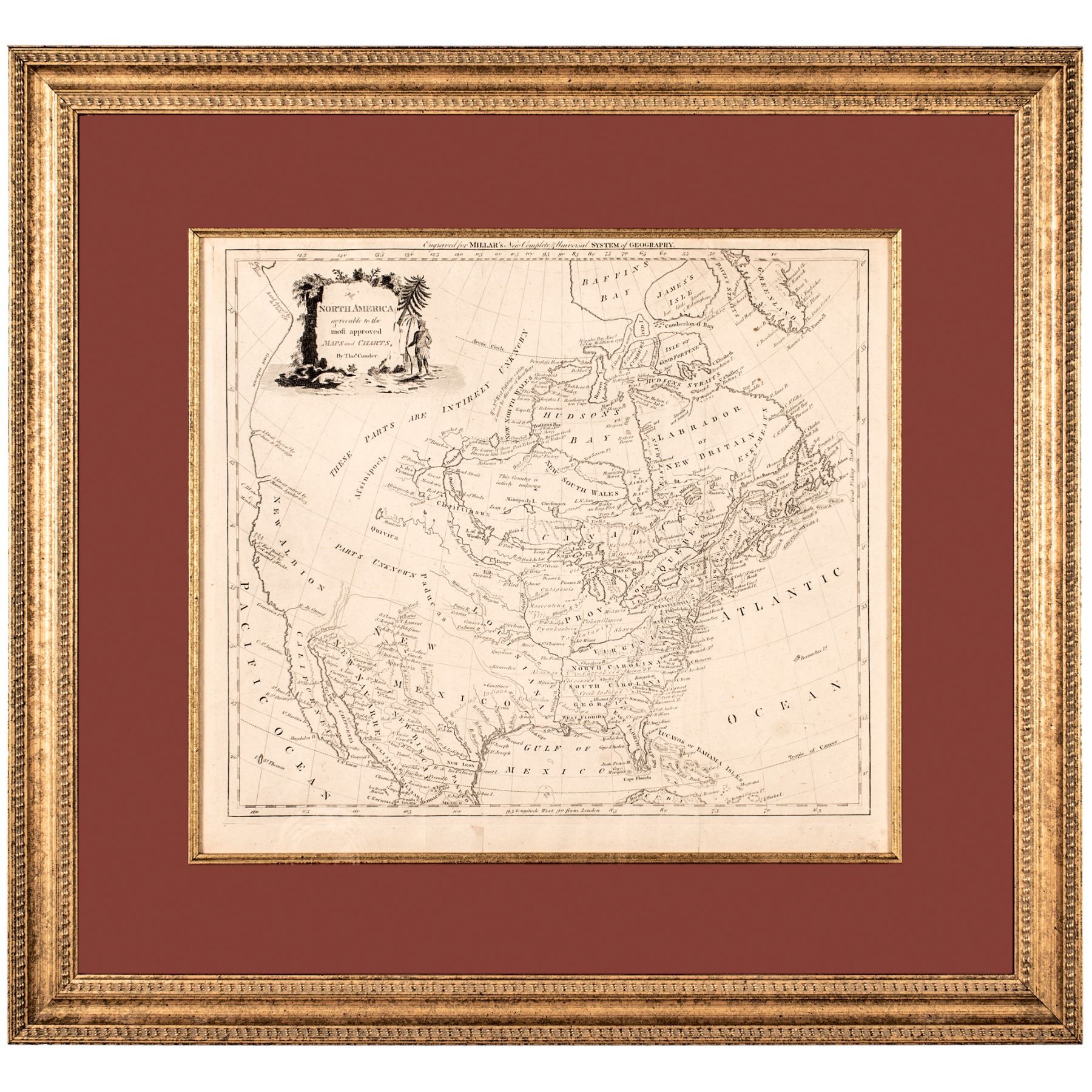 Beautifully modern framed Decorative Map of North America with a large title cartouche. Measuring about 15.75” x 14” (by sight), matted and professionally framed to 24.5” x 22.75” viewed under special UV Plexiglas. Text along upper margin reads, “Engraved for Miller’s, New Complete & Universal System of Geography.” Map shows a massive region in the Northwest labeled “These Parts Are Intirely Unknown.” The strait discovered by Juan De Fuca in 1592 is shown, along with regions on the NW Coast, labeled Coast unknown and Land discovered by de L'Isle 1741. The apocryphal “Martin D'Aguilar Strait” discovered in 1603 is shown. Sir Francis Drake's Port where he remained for 5 weeks is noted. The Mississippi is shown trending far west of its true course, along with a number of other mythical rivers. Several early French Fur trading forts are shown west of Lake Ouinipiuqe (Winnipeg). A number of early explorations and discovery notes included around Hudson's Bay. Many Indian Tribes are noted. Lands of the American Colonies extend to the Mississippi. East and West Florida is shown. Overall, a very clean well printed fine illustration with just some light folds, of the known and unknown parts of North America, at the outset of the American Revolution.