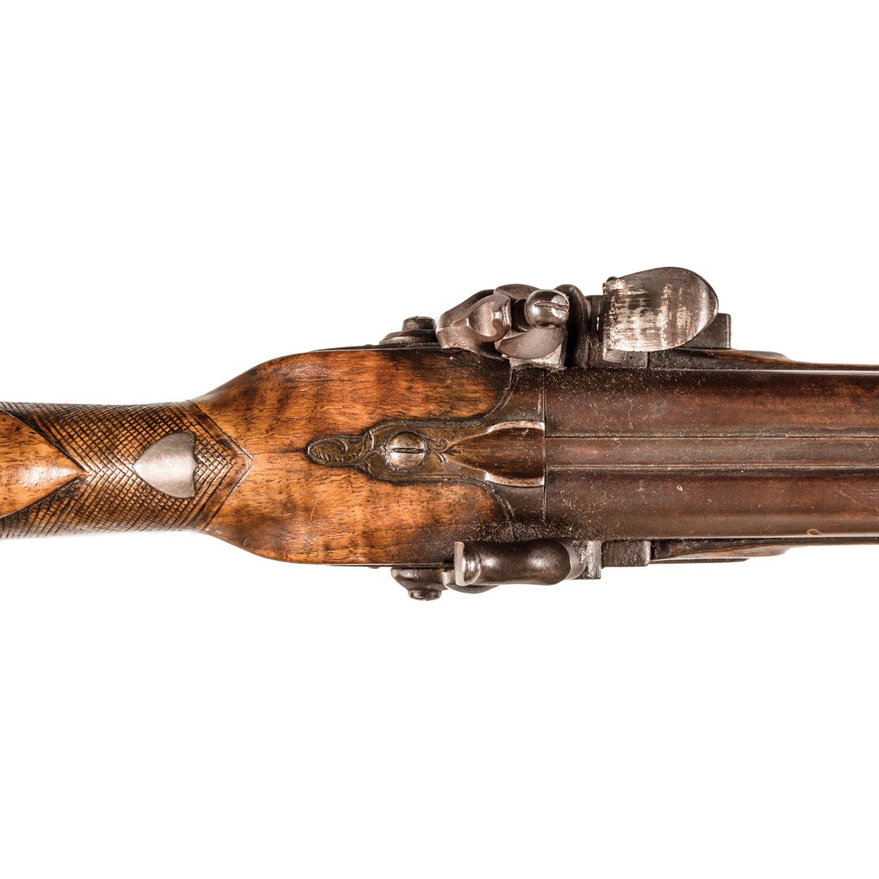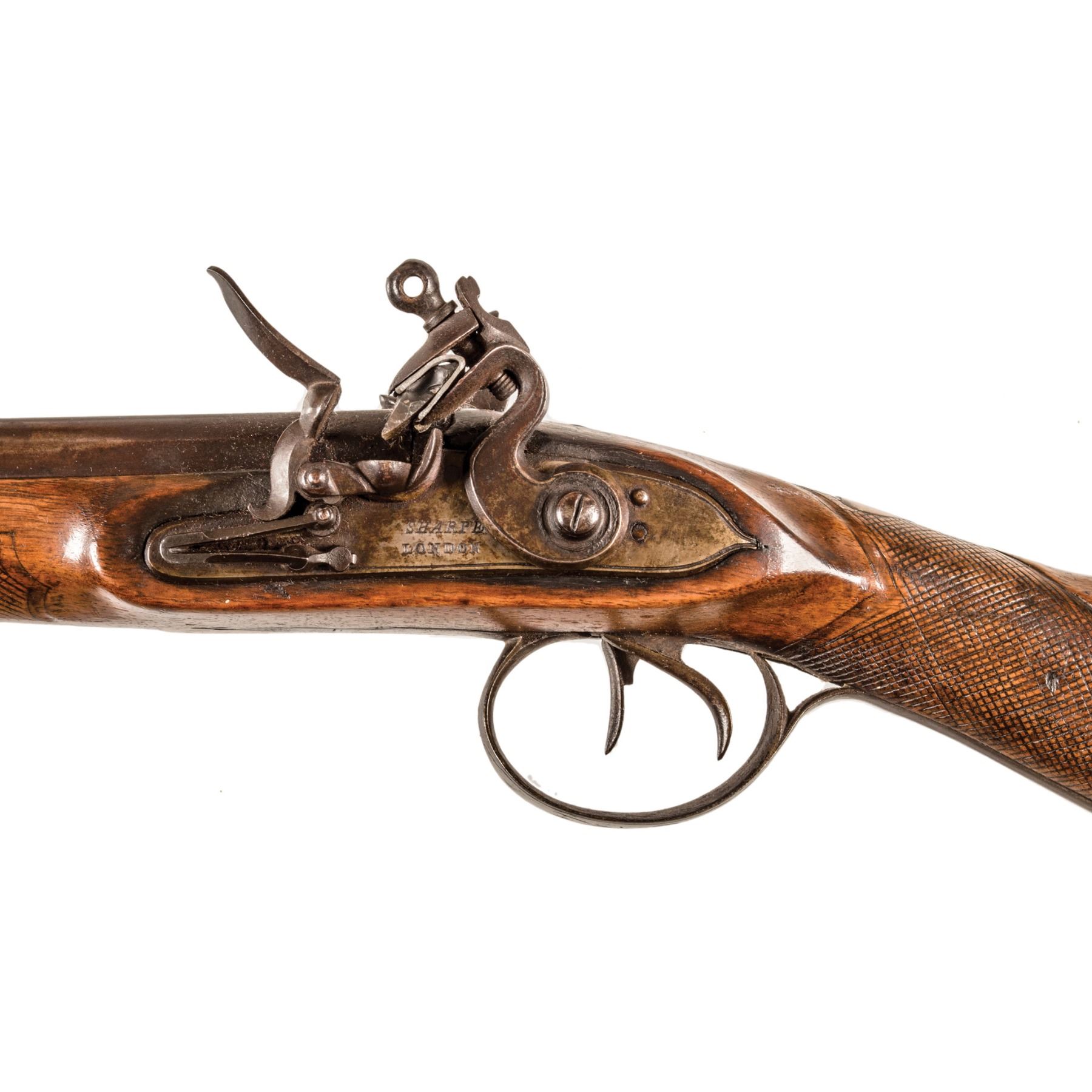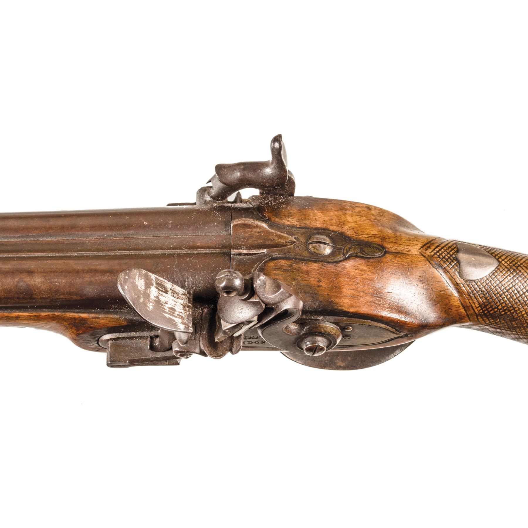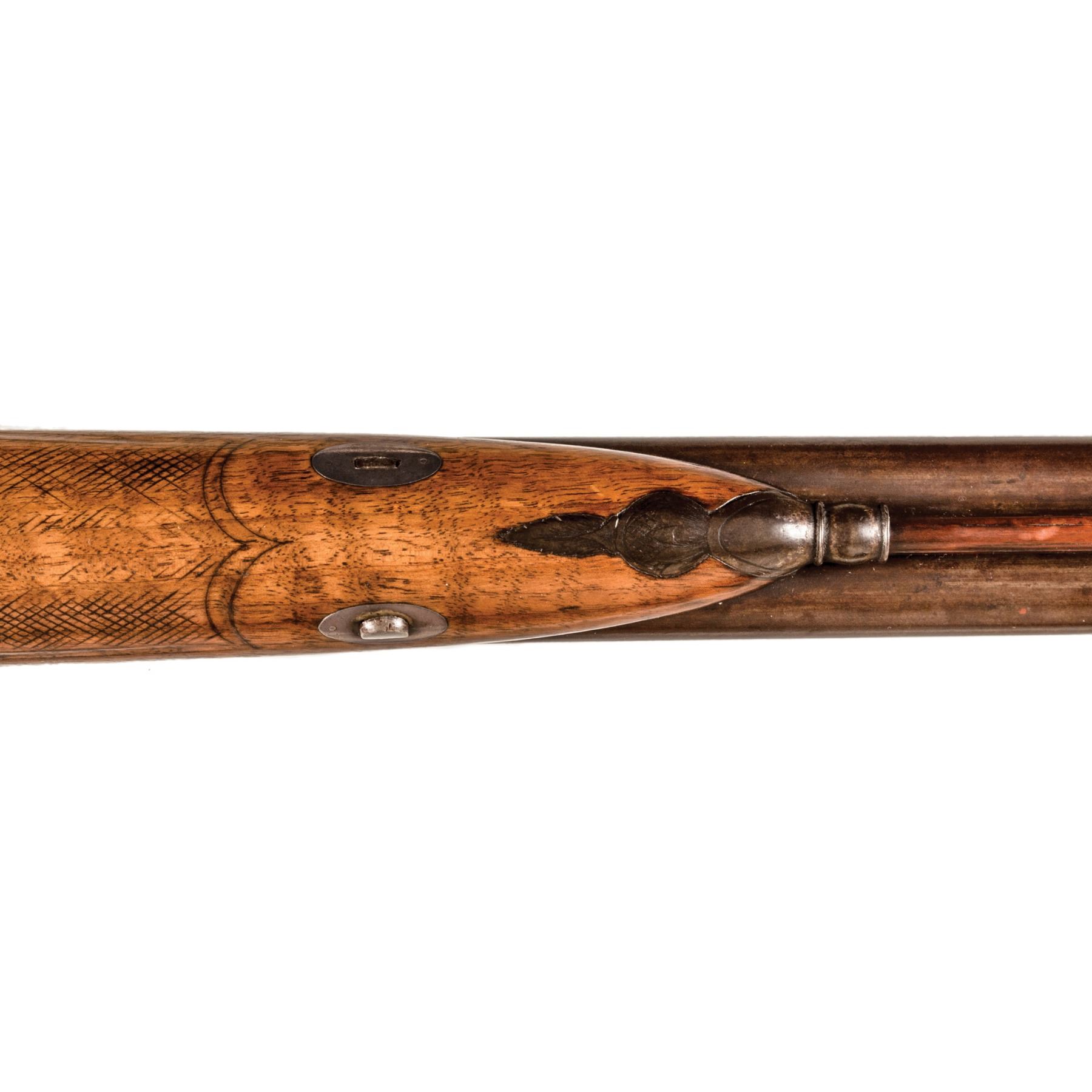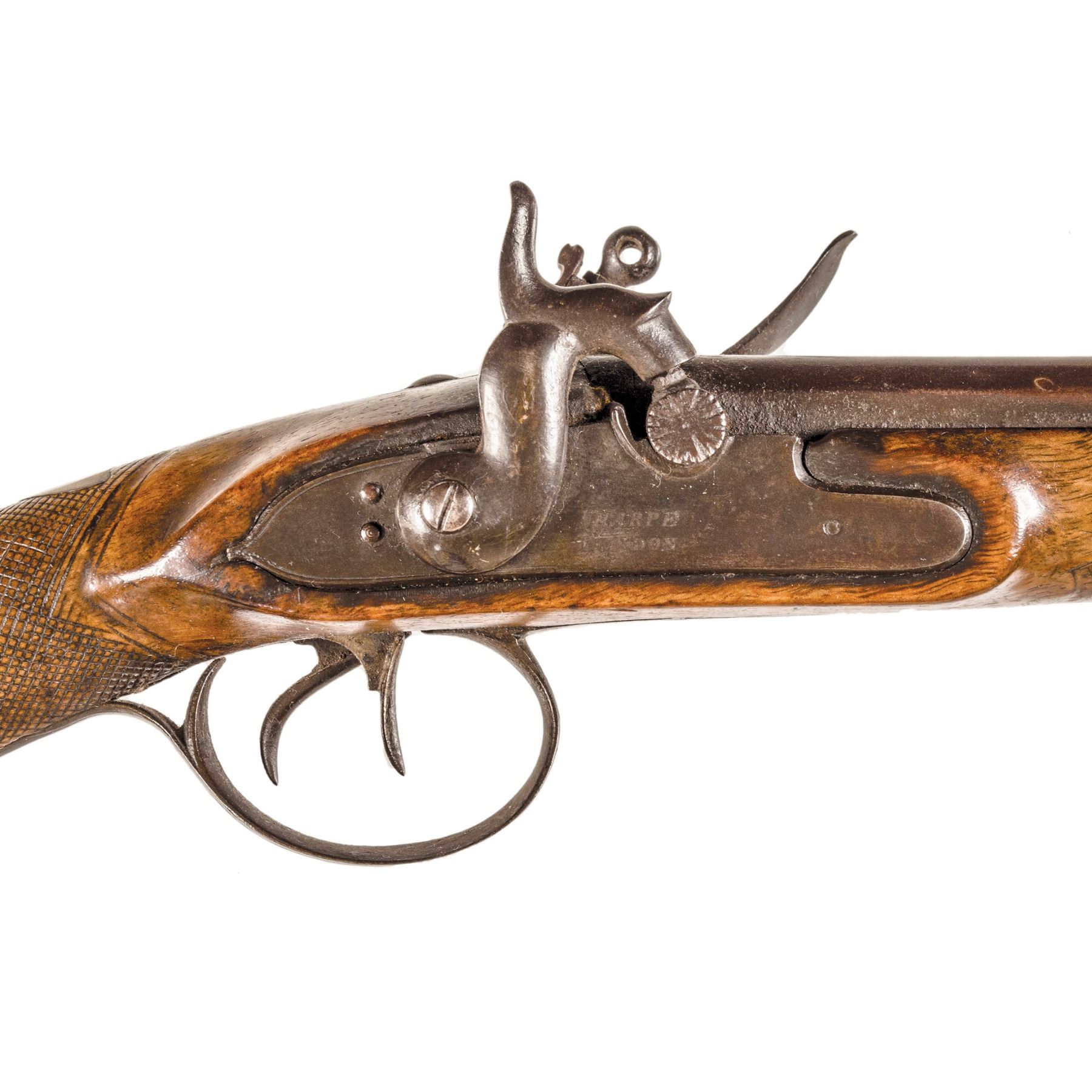 This example measures 50.5" overall having a 34.25" .58 cal. 22 bore steel round barrels with simple decorative detail at the breech. Plain boarder engraved locks marked: “SHARPE, LONDON”. Engraved Steel furniture with German Silver barrel key escutcheons. The stock has nice checkering and is solid with only light scratches and dings from years of handling. An interesting Double Barrel flint Fowler, where the original owner was smart and only had One Side converted to percussion! In good working order.
