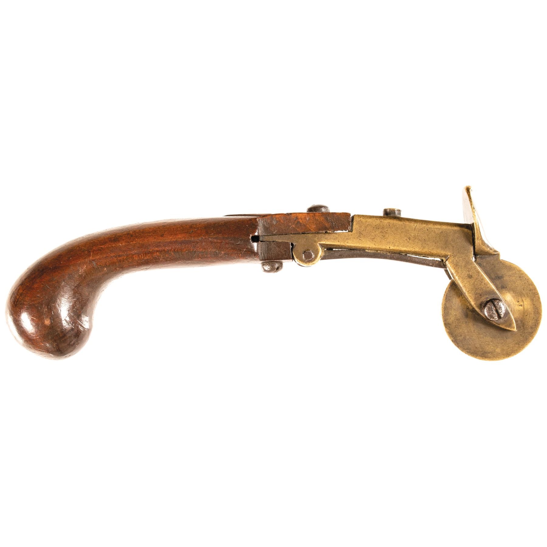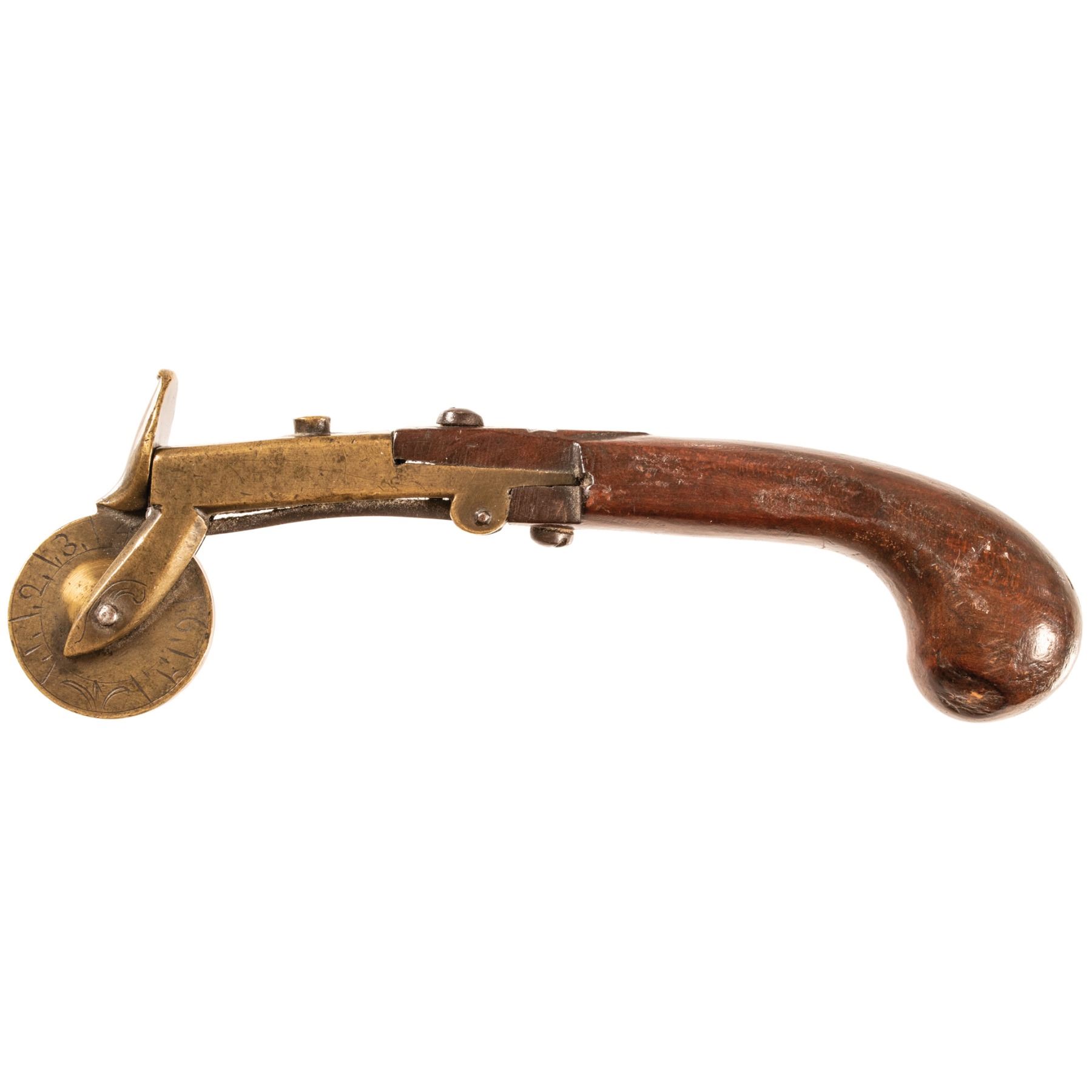 This hand-held Powder Tester measures about 6.75” in length, it is unmarked except for the extensive hand-engraving on one side of the circular brass dial. It consists of a brass wheel connected to a cover mounted on the front of a brass barrel and an "open" touch hole, complete with wood pistol grip. It would be fired by touching a spark or wick to the touch hole, which caused the wheel to be rotated by the pressure exerted against the cover. The number displayed on the dial would indicate the strength/grade of the powder being tested. Overall, in choice, pleasing condition.