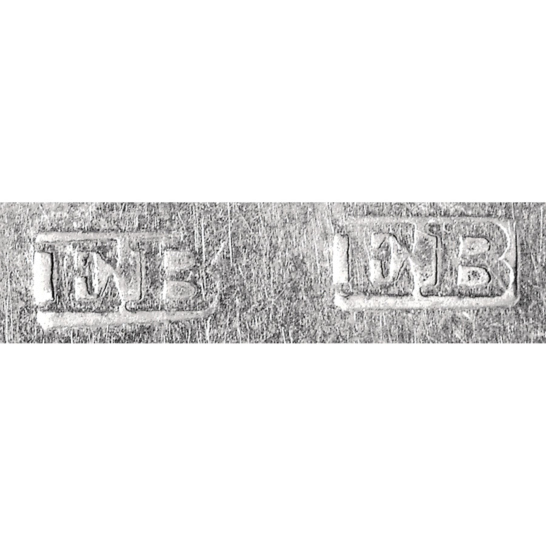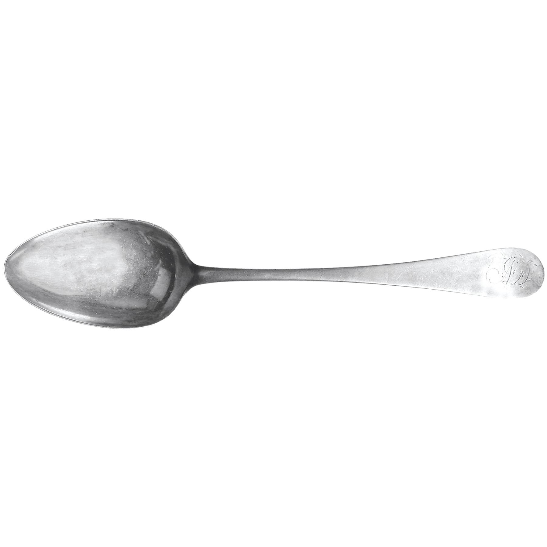 This large 9” long, coin silver serving spoon has ornate engraved initials of the original owner on the top of the spoon handle and two very clear “EB” hallmarks stamped on the bottom side of the handle. It is a beautiful example of his Silversmith engraved work. Ephraim Brasher is listed in “The Book of Old Silver” by Seymour Wyler, as producing silverware out of New York City from 1766. This “EB” style hallmark punch being the most famous and recognized amongst numismatists.