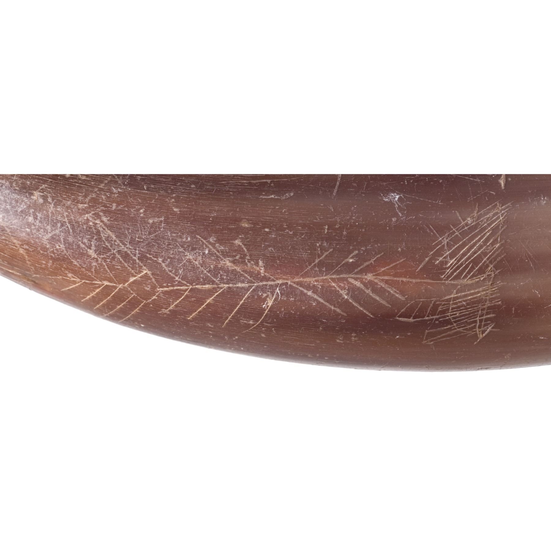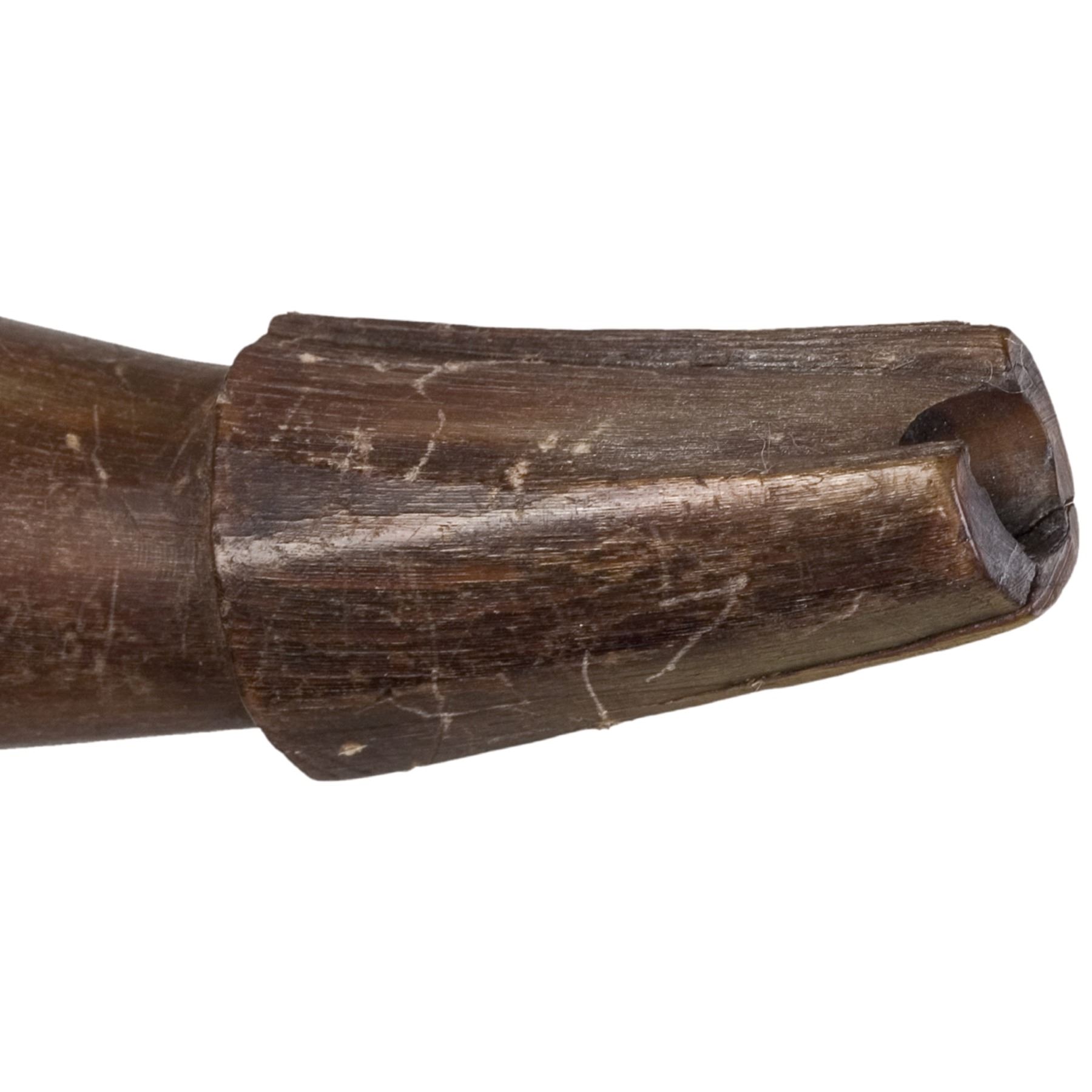 Fully 9.75” in length with a light tan to light brown color at the tip end. A very clean yet simple example of an “every day” Colonial implement. This Powder Horn contains a flush wooden base cap plug. The tip is lightly cracked with a tiny .25" split of off of the end.
