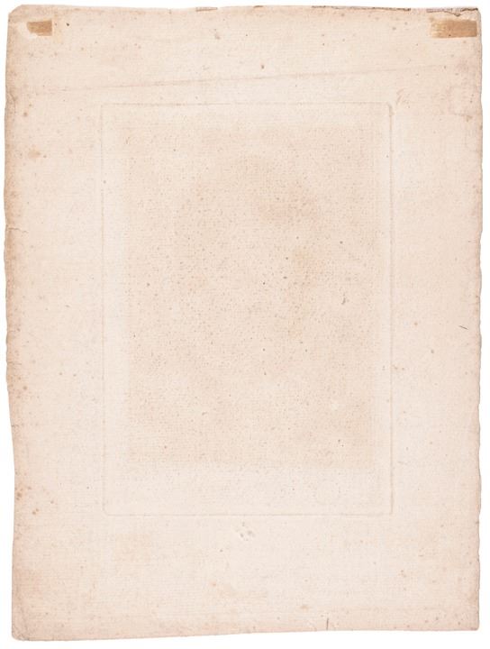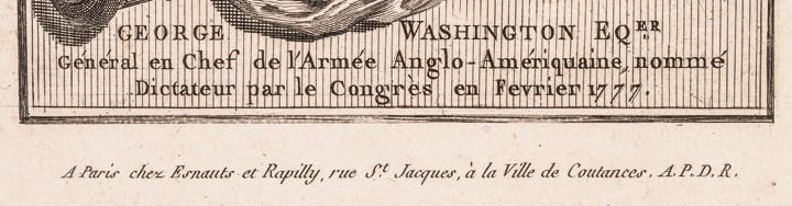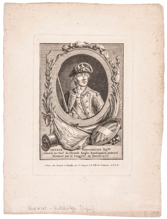 This original apparent Proof Strike Engraving measures 5.25” x 7.5” its Steel Plate outline being deeply embossed into a 8.5" x 11.25" period laid heavy paper page sheet. Some trivial outer tone to the sheet margins with a couple of old mount traces on the blank reverse. There is a large impressively designed central Portrait of General Washington in his fine military uniform is shown holding his sword, inside a decorative outer oval border. Militaria including a cannon, draped flag, sword and shield are depicted below his image. The legend title is remarkable in that it describes Washington as the Genera-in-Chief of the Anglo-American Army, chosen as Dictator by Congress in February 1777! It reads, in full: “GEORGE WASHINGTON EQER - General en Chef de l’Armee Anglo-Ameriquane, nomme Dictateur par le Congress en Fevrier 1777.” The print quality is of a deeply impressed Proof Strike with every detail extremely sharp and distinct on a clean central portion of the sheet. Listed as Hart 743.