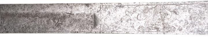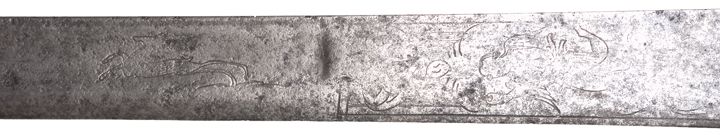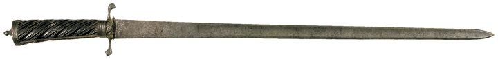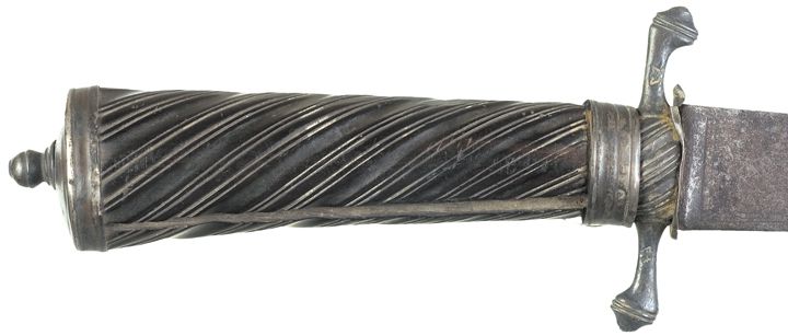 This is an original, Revolutionary War Era fancy design, high quality Sword, that is typical in style as would be also carried by a higher ranking military officer. The style of the Silver cross-guard, ferrule and washer, and button top pommel, with an overall appearance of Hungarian/Polish royal family in style. It is hallmarked on both sides of the cross guard. The ebony grip has an ornate spiral groove design. The blade is straight with a shallow groove on both sides once past the four inches of flat metal, upon which are several hand engraved designs including; “Winged Angels” on either side, plus a “Running Boar” and “Stag.” There is light even pitting along the blades full length and retains much original patina. There are two fine lengthwise cracks to the ebony grip, one being the full length, the other half way through the grip. The pommel cap shows some typical wear, is completely original, and is fully intact. A very original condition, important addition of a late 18th century Sword, quite typical in its use at the time as an American Revolutionary War Era ranking military officer’s weapon.