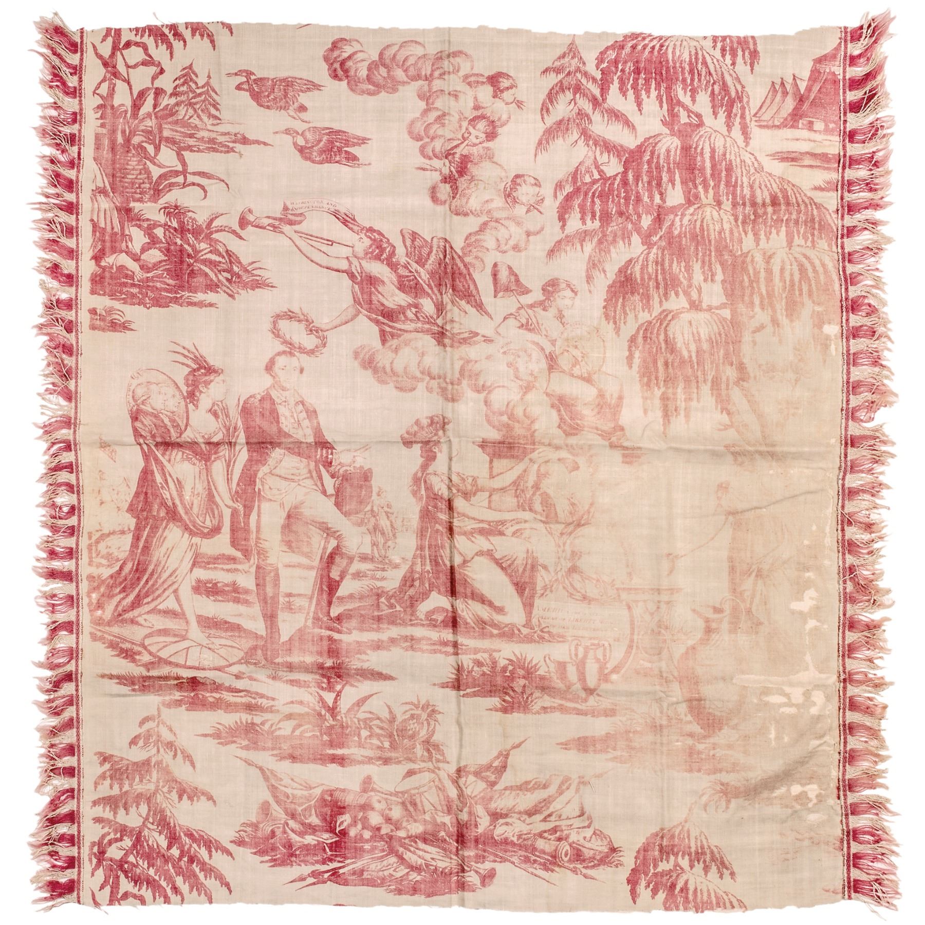 c. 1783 Revolutionary War Era, Red Printed Cotton Textile with Legend, "America Presenting at the Altar of Liberty Medallions of Her Illustrious Sons,” measuring 36” x 30”, English Manufacture on White Cloth, Fine.