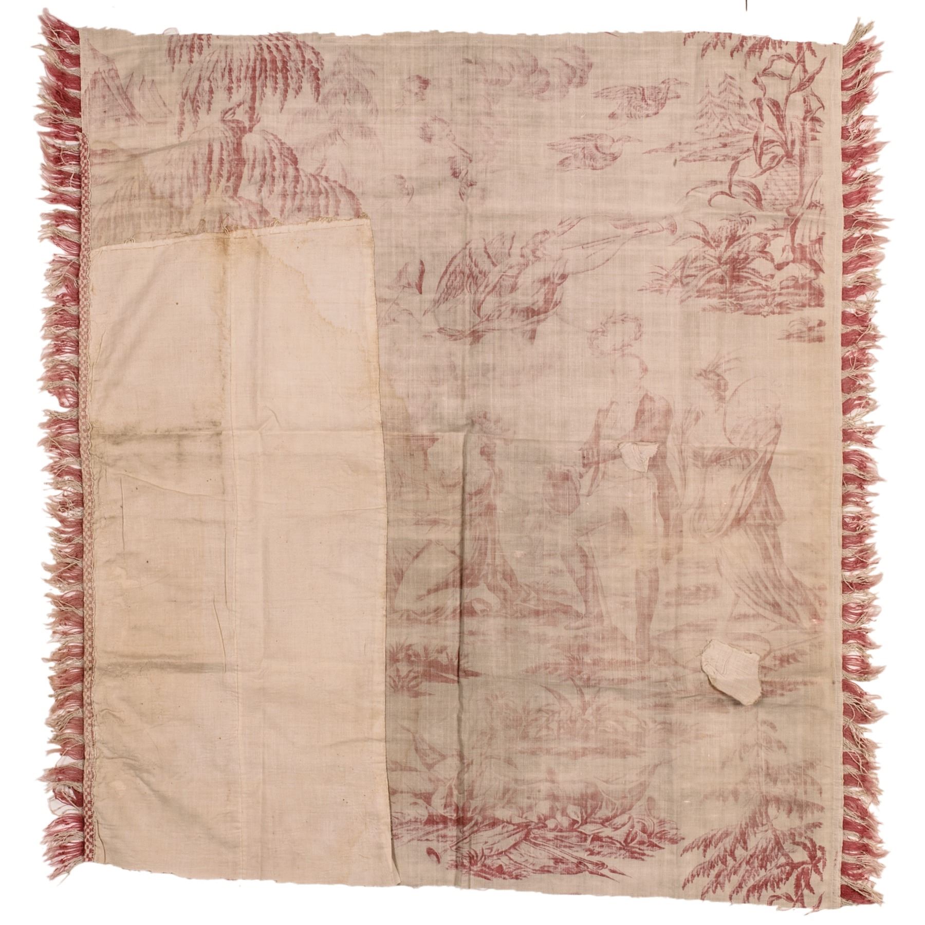 Historic Textile measures about 36” x 30” being an ornately decorated Printed Textile with numerous American Revolutionary War era patriotic motifs and it has been partially Hand-stitched along two edges with some added fringe while the other edges have been left natural. It is printed in red, there is some expected minor fading, a few scattered small trivial holes, with a portion reinforced with material on the blank reverse. Overall, this period decorative textile is of museum quality and would display nicely properly framed. An important opportunity for collectors.