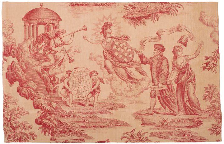 Impressive and Listed as Number 8, page 51, of “Threads of History” by Collins, this red transfer printed textile measures approx. 19.5” x 29.5" on cotton. Titled “The Apotheosis of Franklin,” it features a richly symbolic vignette of Benjamin Franklin and Liberty holding a banner reading “WHERE LIBERTY DWELLS THERE IS MY COUNTRY” near the “Temple of Fame,” and two cherubs holding a map of the eastern United States. The top half of a larger textile which has been trimmed along the bottom edge--absent is the bottom segment with George Washington on a leopard-drawn chariot. This historical textile is still valuable for its depiction of Franklin and Liberty. The left and right edges were machine hemmed but the stitching has been removed, not detracting from the excellent quality of the bright, clean textile that is perfect for framing and display.