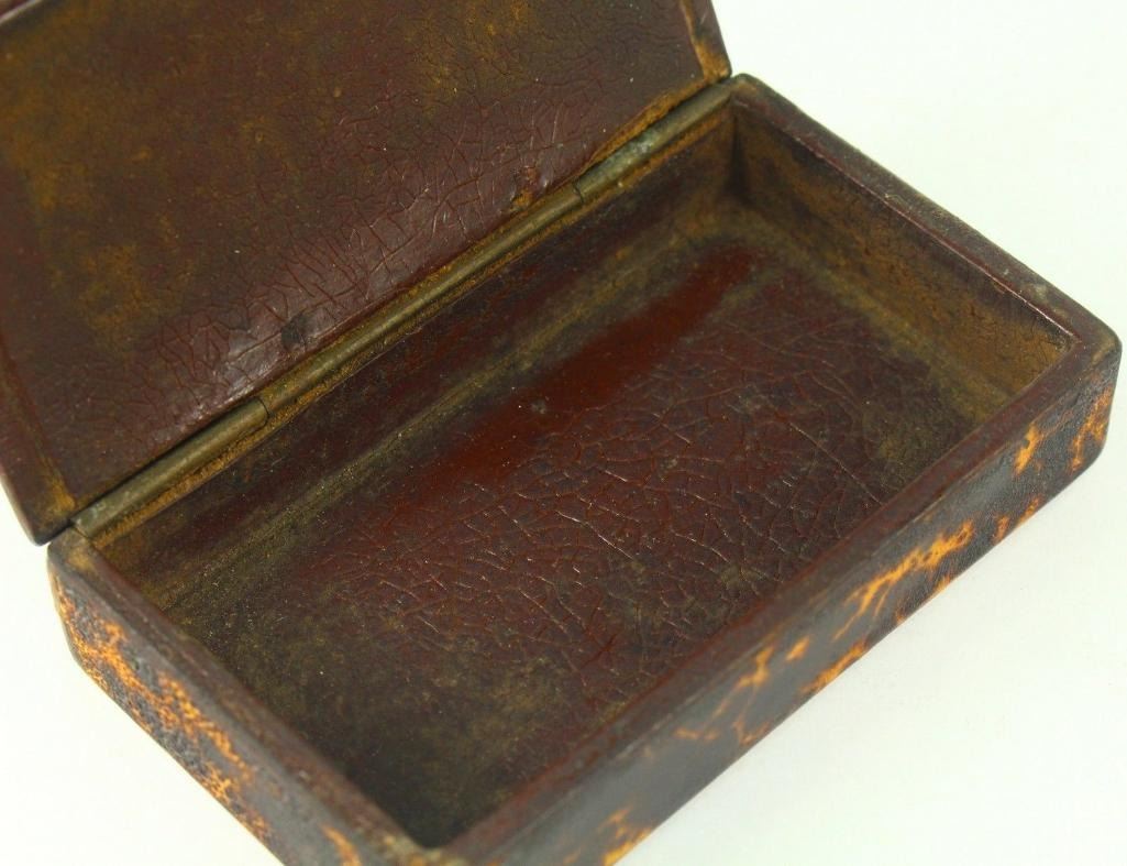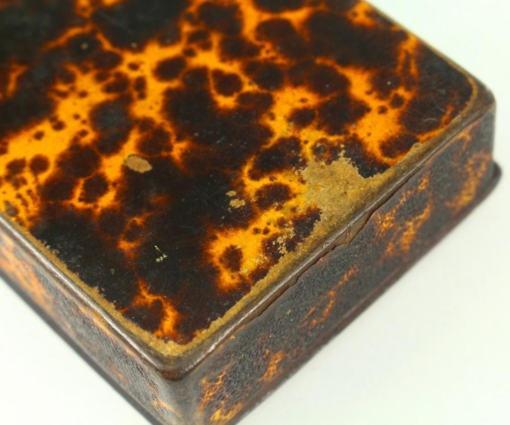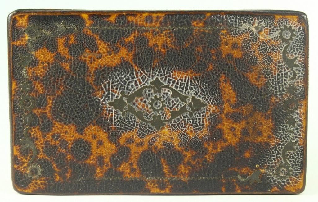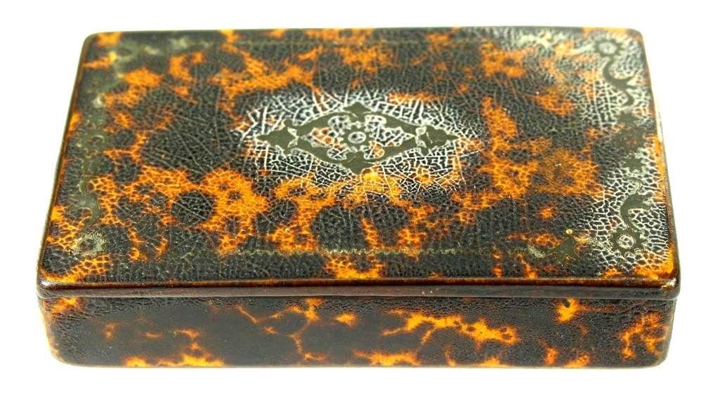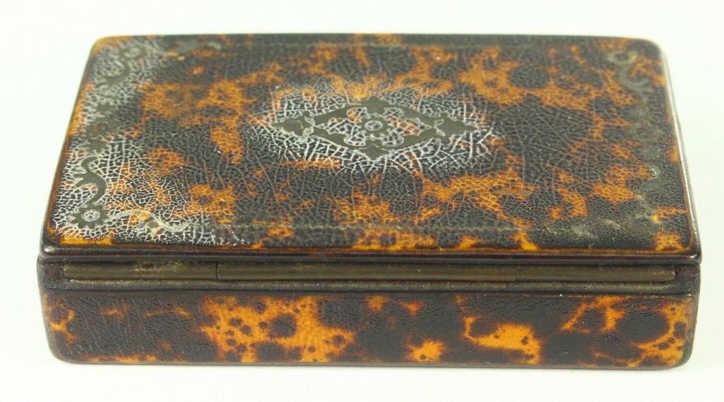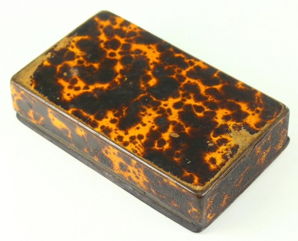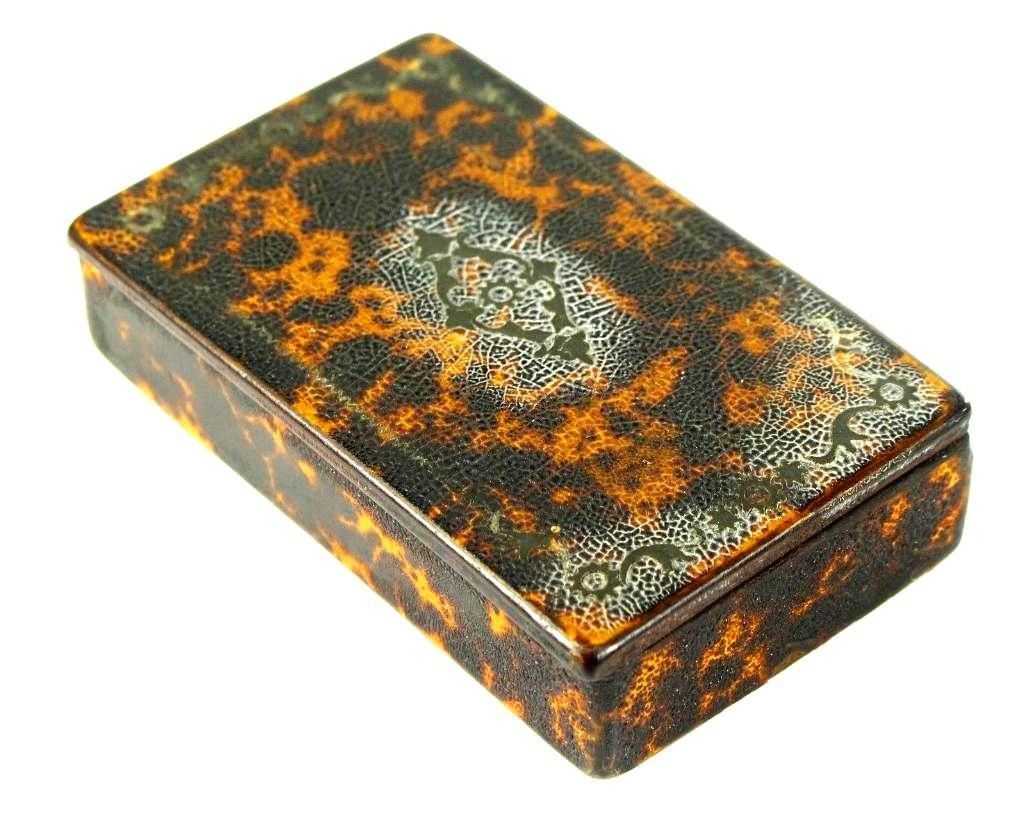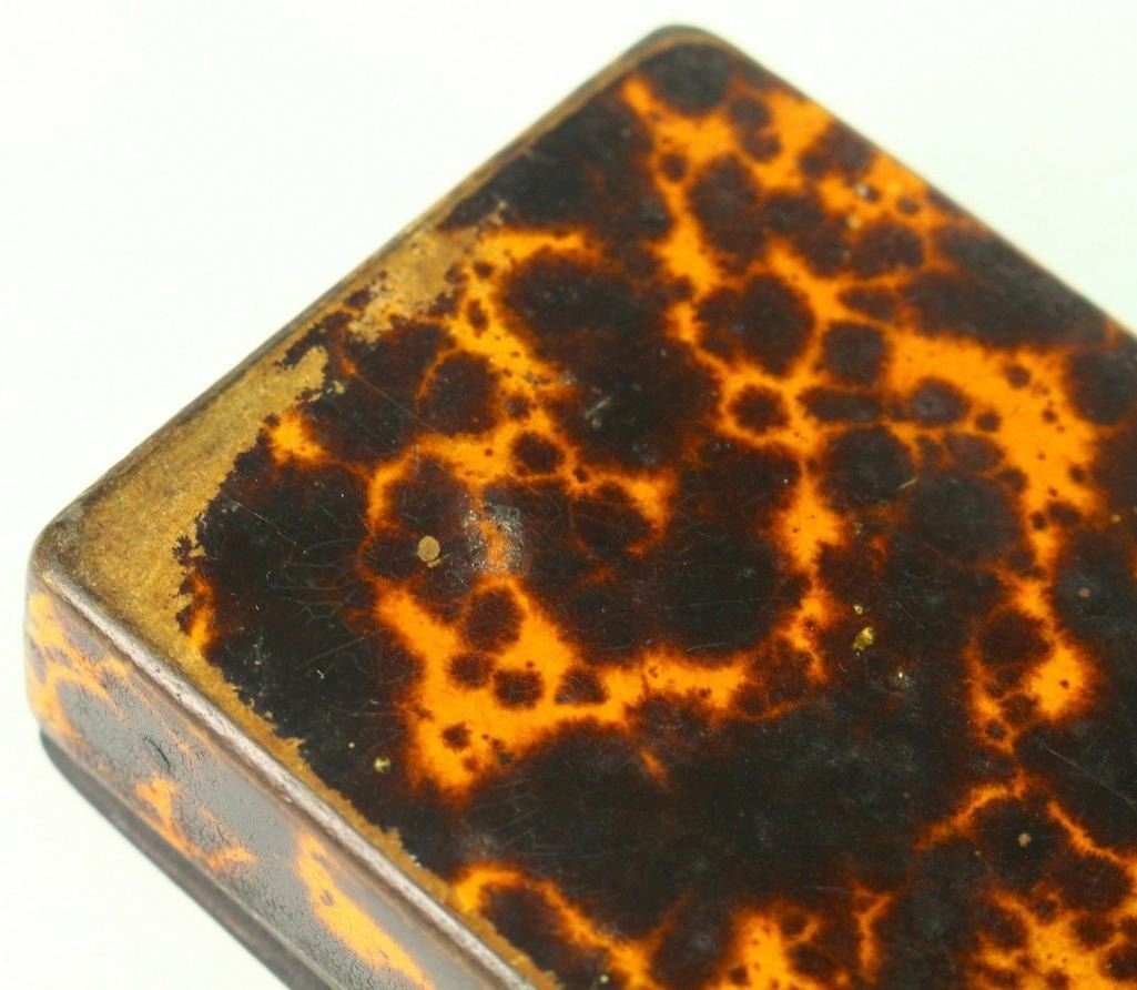 19th C. Antique Faux Tortoise Shell Lacquered Wood Snuff Box Here Is A Very Interesting Snuff Box Wood, Covered With Faux Tortoise Shell, Decorated With Thin Brass Elements On The Top Dates Back To The Late 1700's To Very Early 1800's. Possibly British Measurements: Approx. 3.5" X 2.25" X 0.75+" Condition: Good/vg Overall; Please See Photos Below. Shows Wear On The Edges, Mostly On The Lower Side And The Underside. A Couple Of Missing Minor Parts Of The Brass Elements From The Decoration - 10590-052118-EB-63117