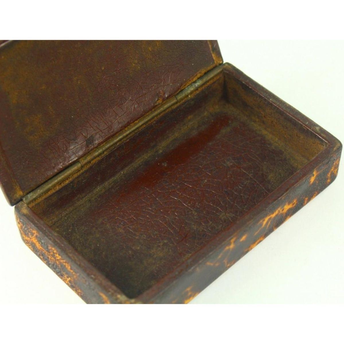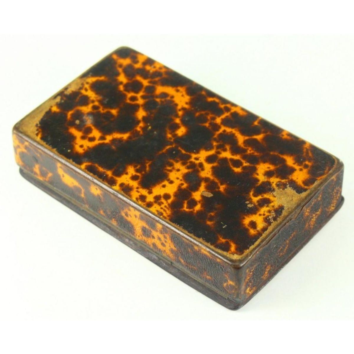 19th C. Antique Faux Tortoise Shell Lacquered Wood Snuff Box Here Is A Very Interesting Snuff Box Wood, Covered With Faux Tortoise Shell, Decorated With Thin Brass Elements On The Top Dates Back To The Late 1700's To Very Early 1800's. Possibly British Measurements: Approx. 3.5" X 2.25" X 0.75+" Condition: Good/vg Overall; Please See Photos Below. Shows Wear On The Edges, Mostly On The Lower Side And The Underside. A Couple Of Missing Minor Parts Of The Brass Elements From The Decoration - 10590-052118-EB-63117