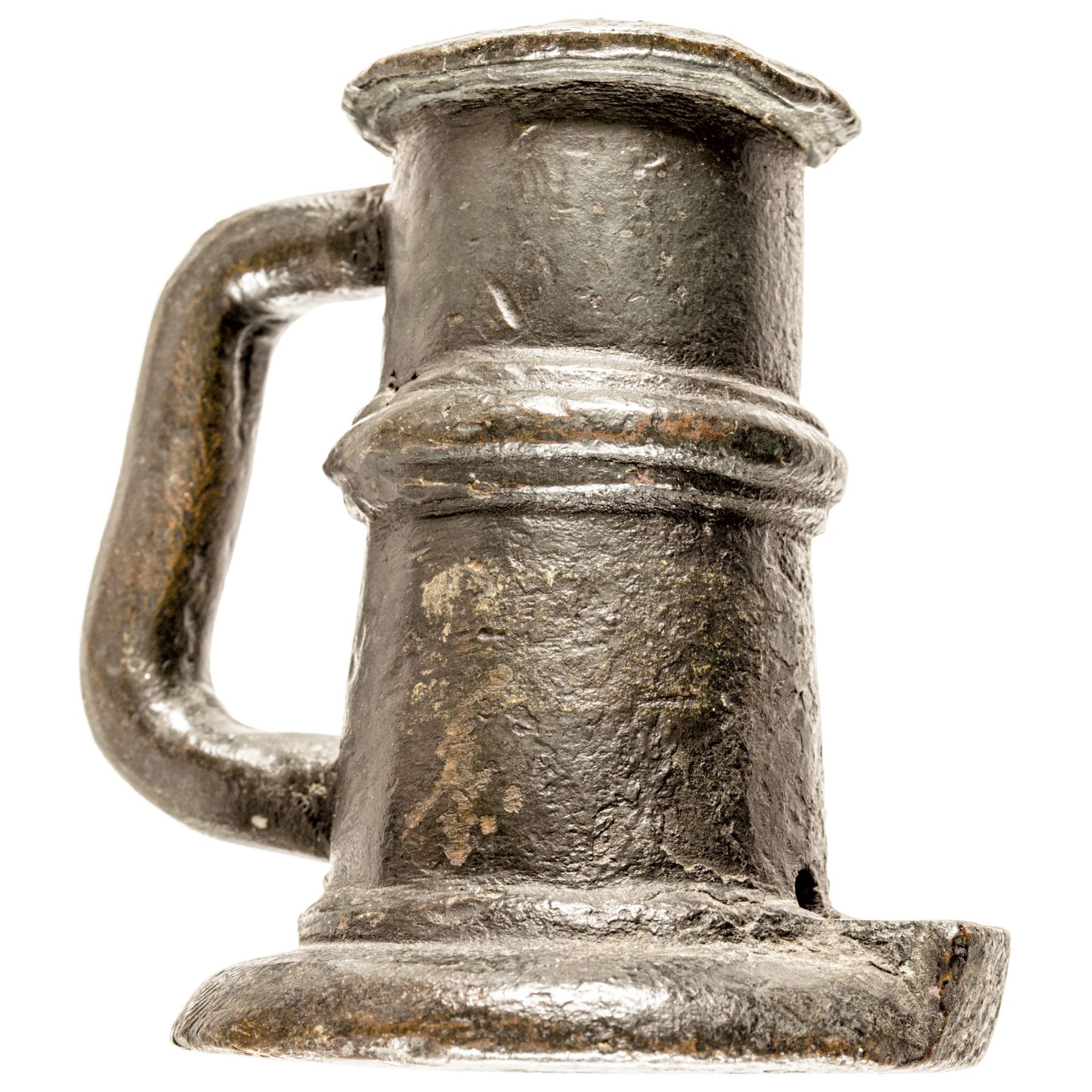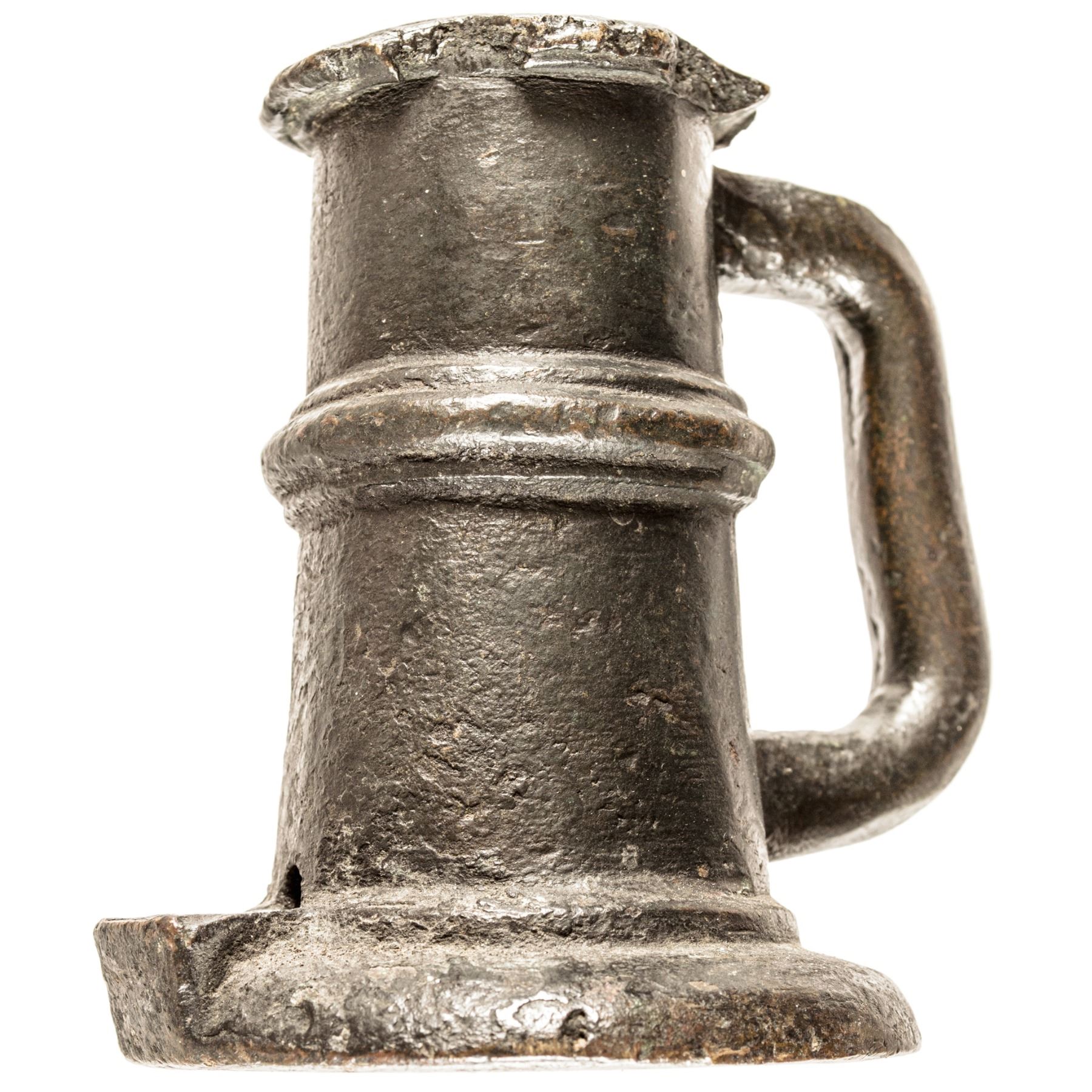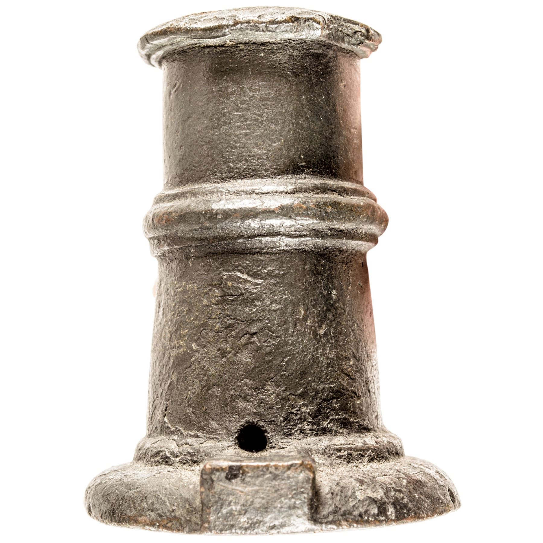 This c. 17th Century Bronze "Thunder Mug" Signal Cannon has a .70 caliber smooth-bore. It measures about 4.75" tall x 3.75" base. A few nicks and small dents around the top rim. The vent hole is clear and its carry handle is fully intact. These small cannon were used for making noise reports, and if required they could fire a small projectile. Ships were required to make a loud report upon entering a port, to signal a small boat to row out to the ship to inspect the health of the crew before allowing the ship to anchor or dock. These noise makers were great because they used small amounts of powder and can be easily moved around. Overall the surfaces retain an outstanding natural deep green-brown age patina that has nice eye appeal for display. Rarely are these made with carry handles.
