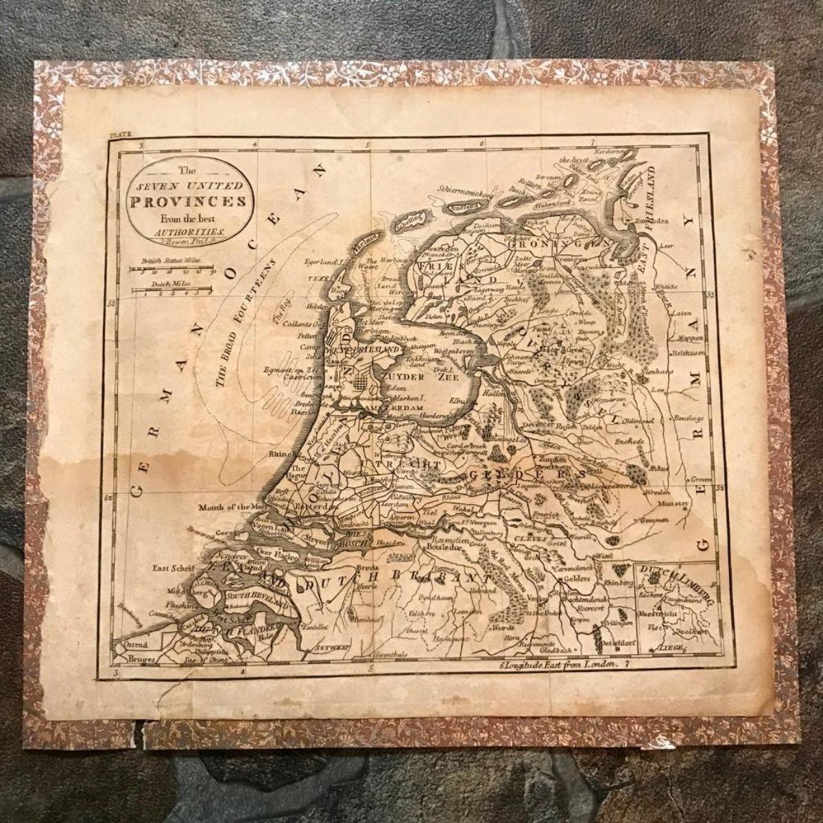 The Seven United Provinces. ( Europe / Netherlands ). Issued c.1800 New York. Engraved for Payne's Geography, Published by J. Low. Very early American produced map of the Netherlands. Engraved, possibly a re-issue of an 18th-century copper plate.  Sheet measures c. 8 1/2"H x 9 1/2"W. Engraved Area Measures c. 7 1/4"H x 8 1/4"W. Cartographic Reference(s): Tooley's Dictionary of Mapmakers, vol. 3 Previously mounted on a sheet of 19thc printed paper. 9 1/4" X 10 1/4". * map has foxing & a tear to the bottom left edge, as seen in photos.Â