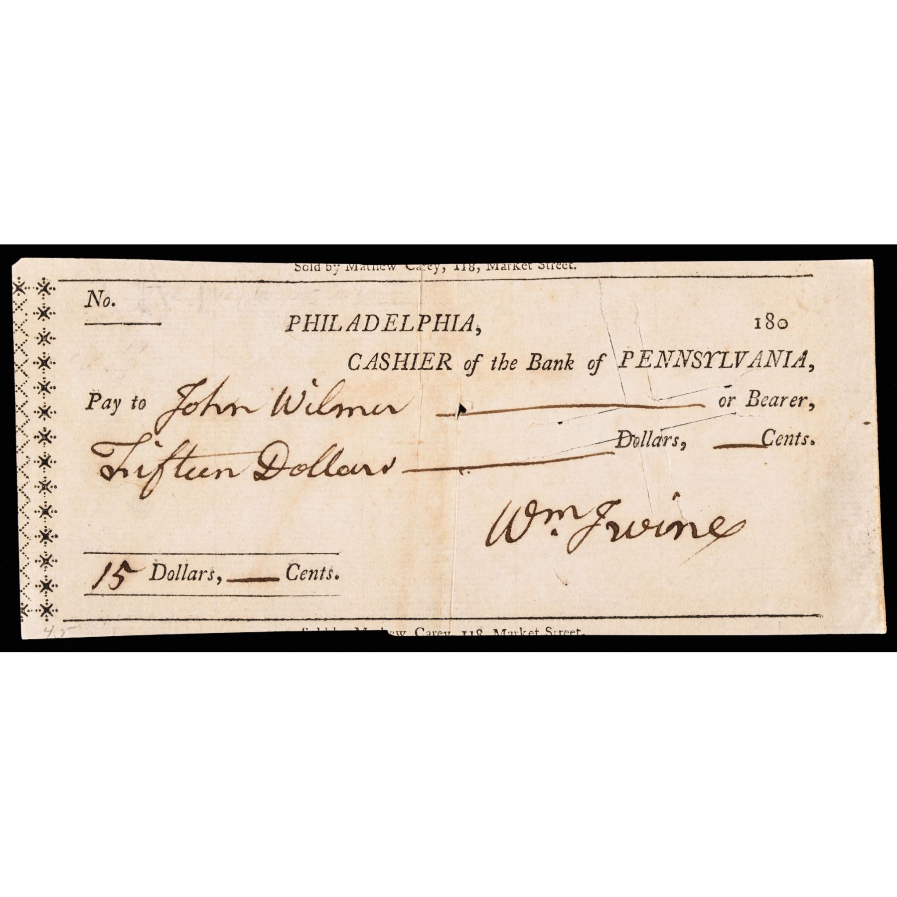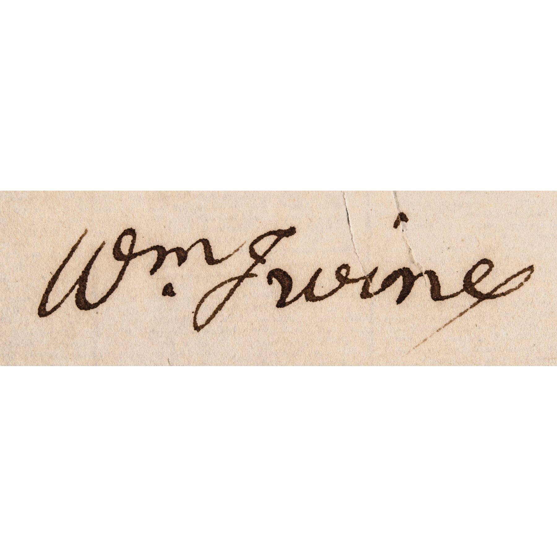 c. 1800 Federal Period, Partly-Printed Autograph Document Signed, “Wm. Irvine”, measuring 5.75” x 2.5”, 1 page, (undated), Philadelphia, PA., Choice Very Fine. Being an early Bank of Pennsylvania Check with the manuscript portion filled out in Irvine’s hand. Payable to “John Wilmer” in the amount of $15 with a light cut cancel, otherwise sharply printed and vividly completed and Signed.