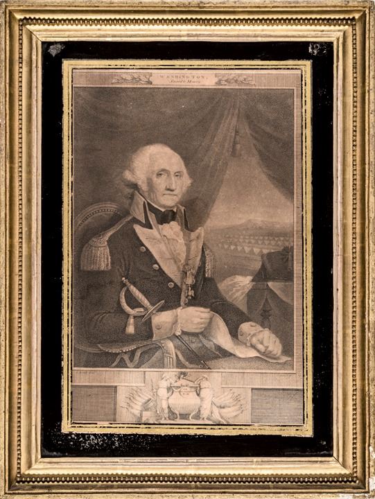 Barralet Engraving After D. Edwin and F. Bartoli (Hart 788), and as illustrated in Wick. Measures 9” x 14” by sight. The original glass "matte" is reverse painted in black and gold, with its apparently original decorative 14.75” x 19.75” gilt wood frame, some trivial outline paint has bubbled and flaked off. Engraving displays a seated General George Washington in his military uniform with sword at his side. The text in top center reads, “Washington, / Sacred to Memory.” At bottom center, a darkened American Eagle is perched atop what appears to be Washington’s Sword, two female figures stand next to a central Funeral Urn with their hands over their faces in mourning, all flanked by many flags, plus cannon and cannon balls. The Urn has a plaque at center which reads: “OB. / Dec 14.1799. / AEt. 68”. Overall a very rare variety being the first we have offered, and a wonderful Engraving framed and ready for display.