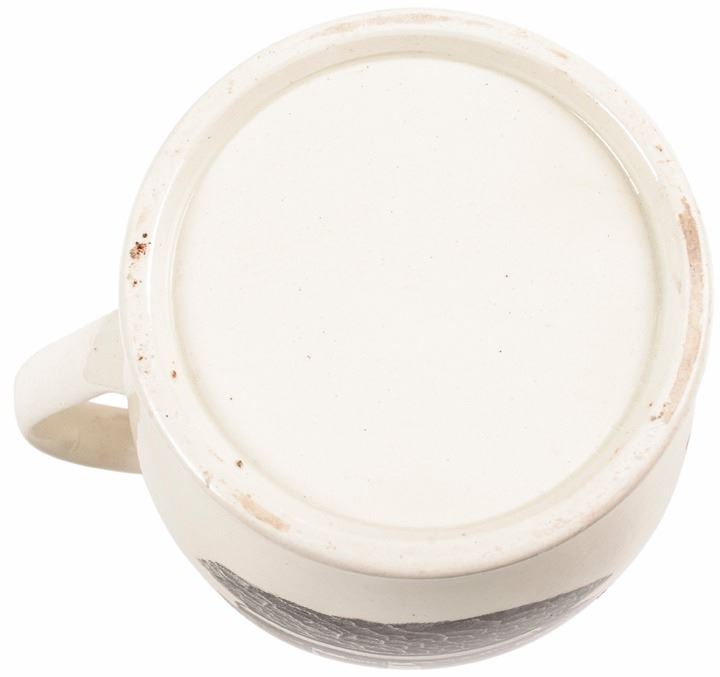 A delightful large size Historical Liverpool Pitcher that is excellent for display. It measures 9.5” tall and is 5.25” at its base. Produced for the American Market in England as a decorative George Washington Patriotic Commemorative Memorial Tribute Display. The surfaces and extremely clean and glossy smooth having choice transfers, with one fine hairline inside the pitcher at its spout, as made when fired. The main transfer legend reads “Ascending into Glory” shown listed as W.41 on page 206 of Arman’s book, “Anglo-American Ceramics” (1998). It prominently displays President Washington dressed in Roman style toga robes, being carried up to Heaven by an Eagle and Angel. The imagery of “Liberty” sits below, with her head in her hand in mourning, while two other figures watch his ascension. Below George Washington is a plaque which reads: “Sacred to the Memory of Washington” including his birth and death dates. The upper portion of the scene has five Winged Cherubs watching. The opposite side displays a large Three Masted American Sailing Ship flying a 15 Star American Flag, of a transfer design variety unlisted in Arman. Under the spout is a Seal of the United States, listed as S. 17 (without the Jefferson quote) on page 163 in Arman. It shows a American Heraldic Eagle with ribbon in it’s beak inscribed with the motto “E Pluribus Unum”. Overall, this is one of the finest quality examples of this popular major design type we have offered.