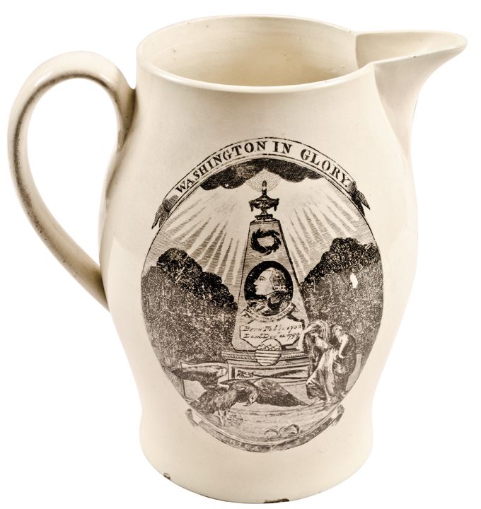 c. 1800 Federal Period, Historic Liverpool Creamware Pitcher, with Three Patriotic Transfers, “WASHINGTON IN GLORY - AMERICAN IN TEARS” and “PEACE PLENTY AND INDEPENDENCE,” plus Flags & Militaria, Washington Memorial Period, Choice Very Fine to Extremely Fine.
