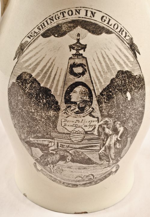 This major type was produced in memory and commemoration of the life of President George Washington. It has two main black transfers, and measures 9.25” tall x 5.25” at its base. The one transfer is listed as “W.44” on page 207 of David Arman’s great reference book, “Anglo-American Ceramics Part I”. Overall in very nice condition, having a few trivial bottom edge rim chips and light wear from actual use. It shows a central image of an Obelisk with a central Portrait of George Washington facing left, with the text “Born Feb 11, 1732 - Died Dec 14, 1799” being flanked by a bowed in mourning American Eagle, accompanied by the mourning depiction of “America” appearing as a woman.