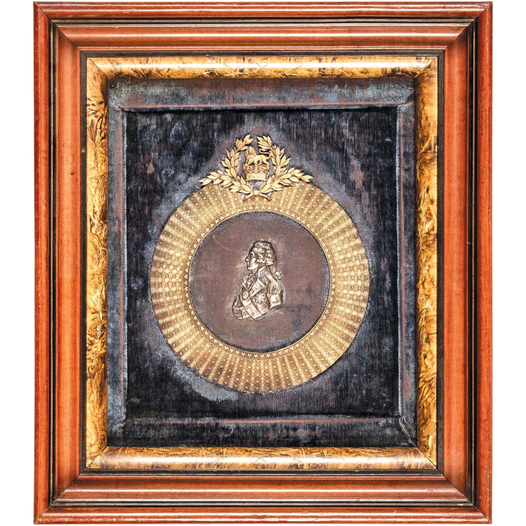 Rare original highly attractive, Antique Admiral Lord Nelson Commemorative or Memorial Wall Plaque displayed in a 3” deep decorative wooden frame. Some light scattered wear to the blue felt background, expected light wear to the outer frame. An impressive central silver or plated metal 2.75” tall High-relief Commemorative Bust Portrait of Nelson in his fully decorated uniform is set inside a fine gold-gilt 9” tall ornate bronze Wreath, set atop a cobalt-blue felt background measuring 10.5” wide x 12.75” tall (by sight). Deep double-framed with inner walnut decorative wood, surrounded by custom stained carved wood frame, measuring fully about 17.25" high x 15.25" wide. Provenance: Said to have been owned by a former U.S. Diplomatic Officer.