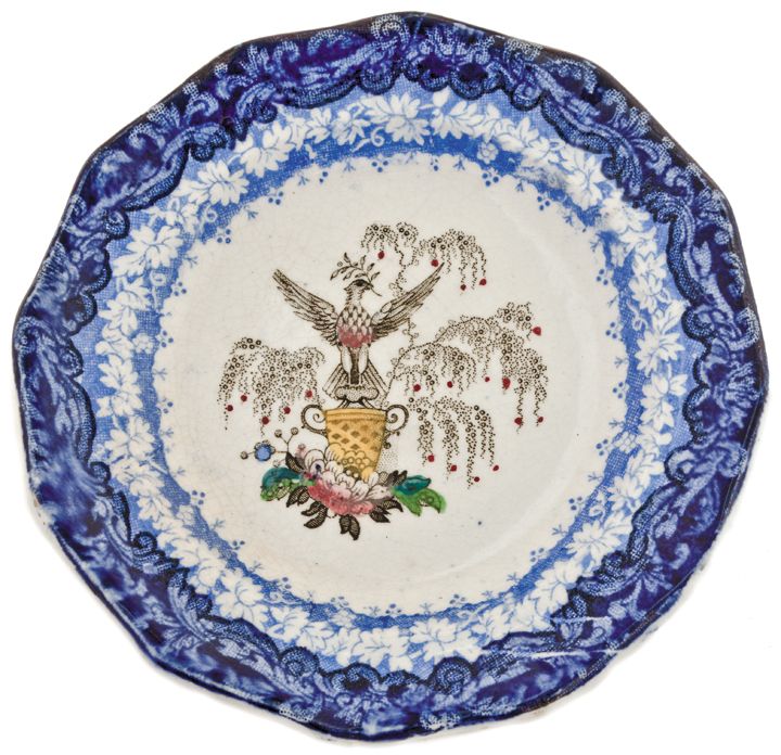 This highly detailed, decorative 4” diameter Pearlware Cup Plate has black transfer chinoiserie-style central decoration with a majestic American Eagle shown upon an urn at the center which is nicely enhanced with polychrome colors, and a rich deep blue transfer floral outer border with blue overglaze. A beautiful and unusual American Eagle Decorated Pearlware Cup Plate design that is not listed in the Arman reference.
