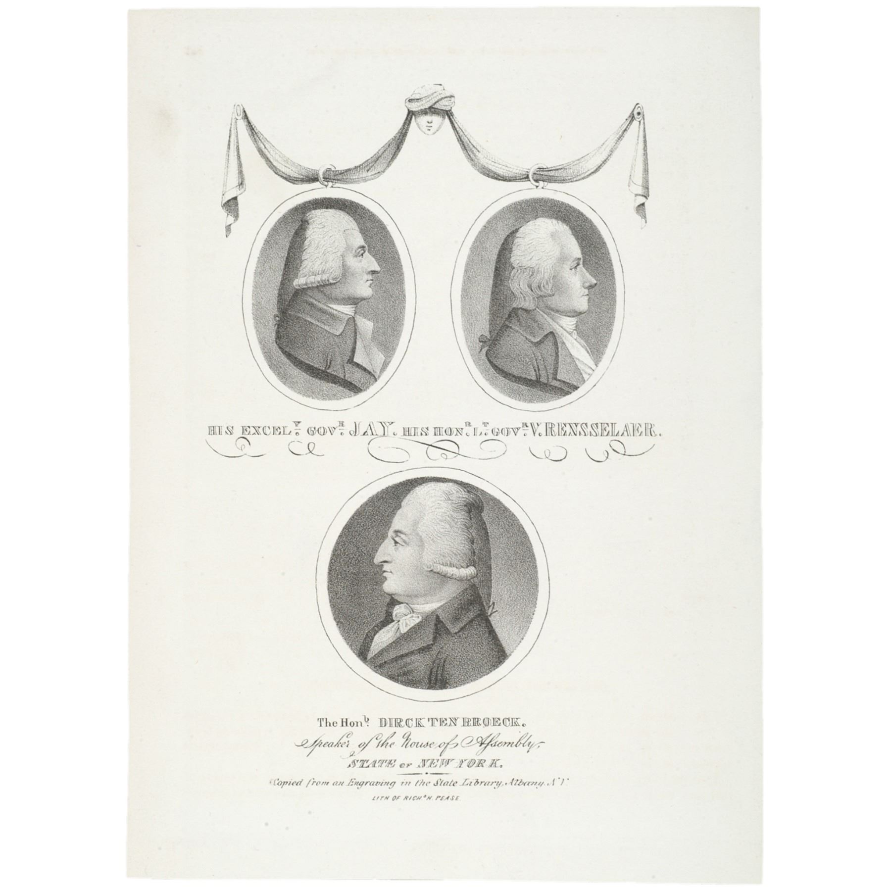 4. Portraits of the Governor, Lt. Governor and Speaker of the House of New York, JOHN JAY, STEPHEN VAN RENSSELAER and DIRCK TEN BROECK, lithograph reprint of the original engraving, printed by Richard H. Pease, choice condition, with 1 pinhole.