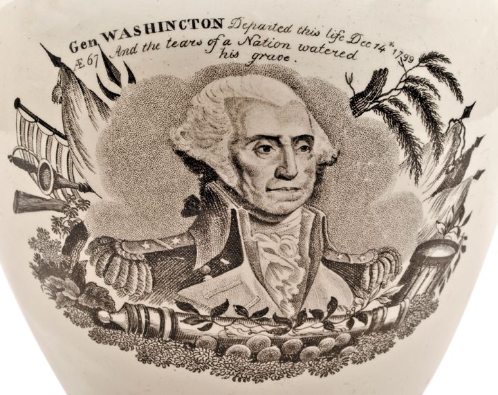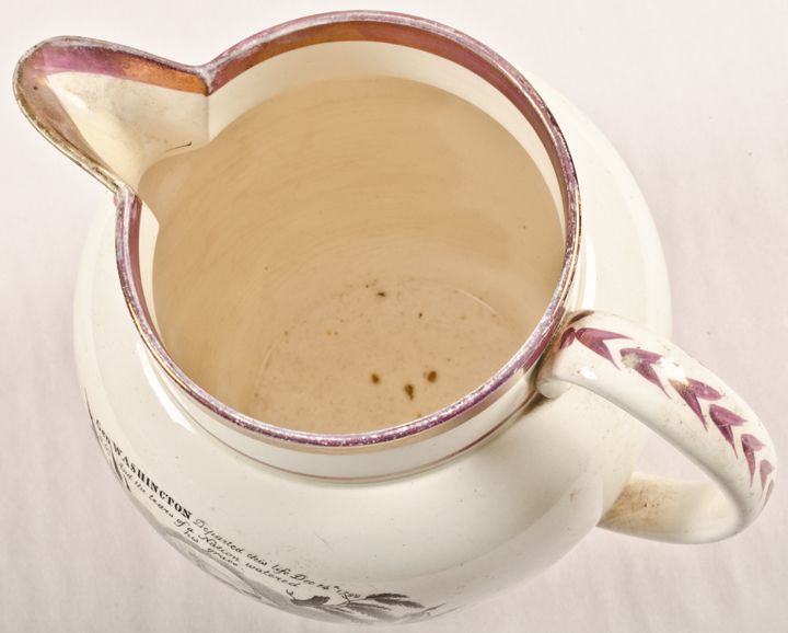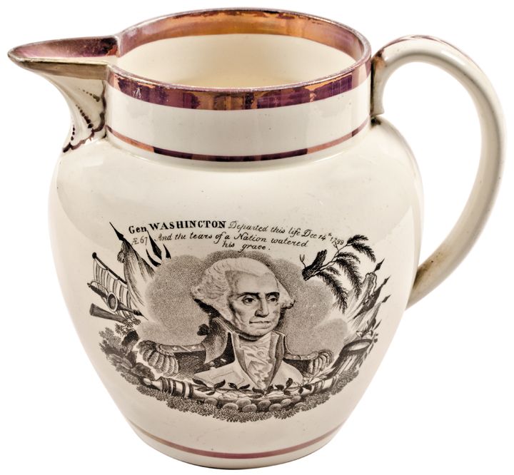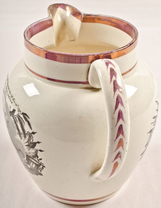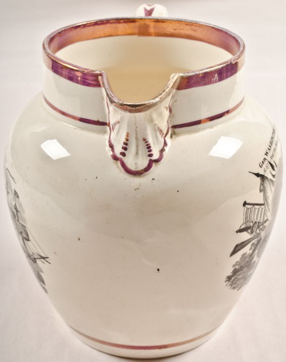 This Patriotic War of 1812 Strawberry Luster Pitcher or Jug measures 6.5" tall. It was produced in England for export to America at the close of the War of 1812. Both deep black transfers are exceptionally bold, sharp in detail and crisp in eye appeal. There is some slight faint tone to the body and a hidden discolored area of restoration to the inner right side edge of the spout. An aging dealer tag on the bottom lists an old asking price of $3,250. One side has a transfer listed as Arman style “W.36,” located on page 205 of David Arman’s great reference book, “Anglo-American Ceramics Part I.” showing the transfer with legend reading: “Gen Washington Departed this life Dec 14th 1799 AE 67 And the tears of a Nation watered his grave.”