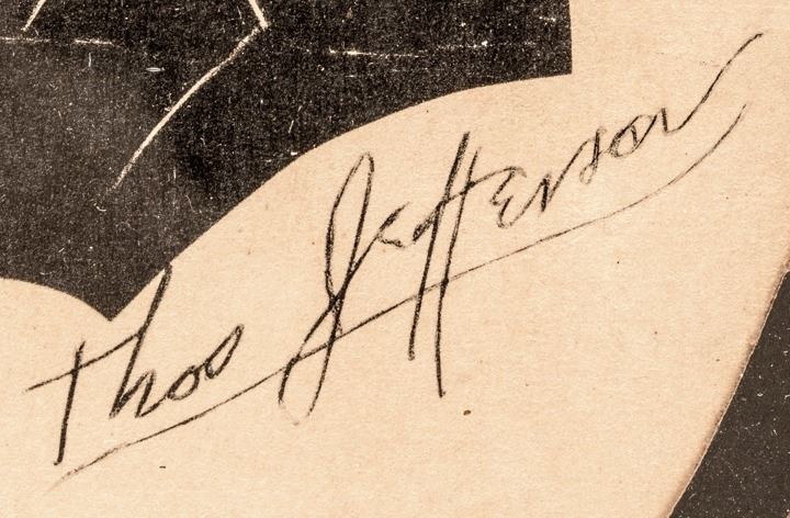 This early American Framed Printed Silhouette Portrait of President Thomas Jefferson is in its original period black wooden frame which measures 5.75” x 7.75”. The central portrait image being 3.25” x 5.25” (by sight) within an oval black matting with gilt decorative highlights in each corner, with facsimile signature “Thos Jefferson” below. Dark and sharp profile silhouette of Jefferson shown facing left, with his name penciled below (not an autograph). Some of the black paint and gilding from the frame has worn off from light wear. Not examined outside of frame. The paper backing on the frames reverse is torn in places yet still intact. A handsome early image likeness of Jefferson, ready for display.