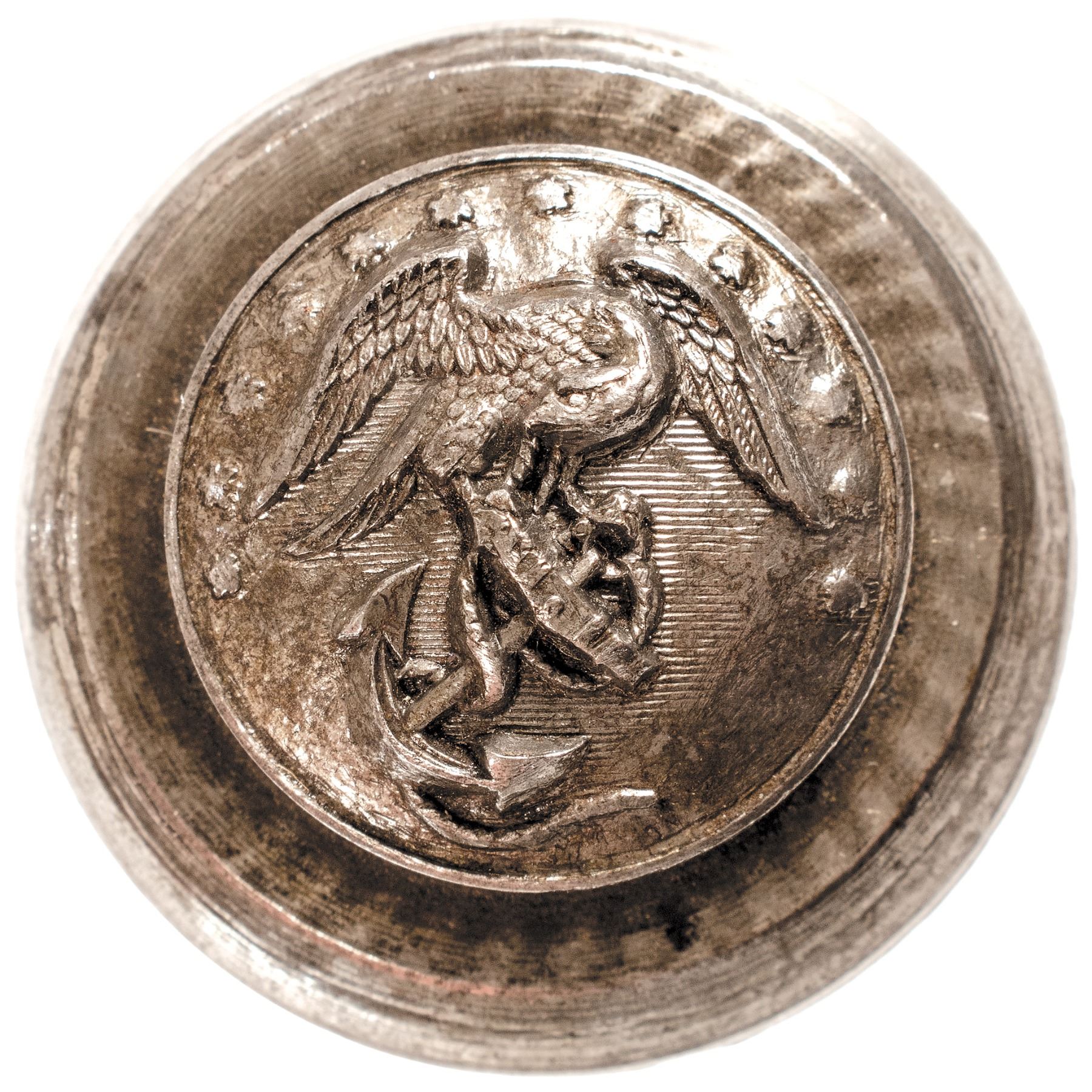 This wonderful Button Die displays a classic military design that shows an American Eagle with a “fouled” Anchor in its talons, adorned with Thirteen Stars above. This die is meant for producing buttons of 24 mm in diameter. A heavy steel die is 40 mm tall x 40 mm wide at its widest point. The Eagle’s design is outstanding, having great detail and sharpness it its feathers and in overall design. The first button die of this type we have offered. This basic style of button is still used for the Navy’s Enlisted Dress Blue uniform. Around 1868, the Marine Corps started using the Eagle, Globe and Anchor version.