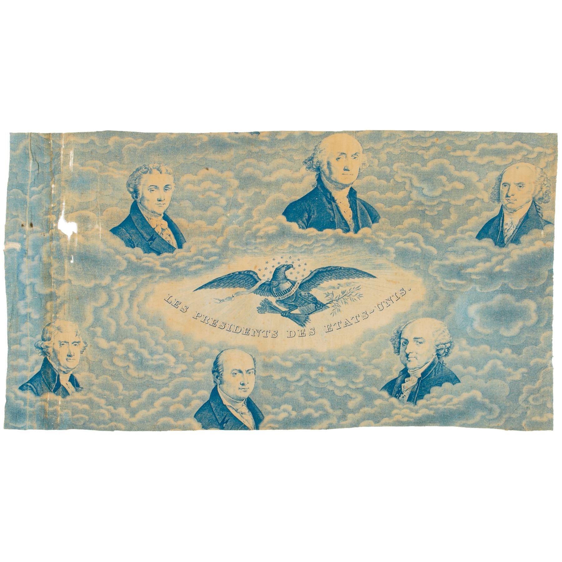 This original printed Historical textile is very similar in style to “Threads of History” listed item Number 70, as found on page 78. Unlike that image, this is printed in blue on white cotton, displaying portraits of the first Six United States Presidents, including: Washington, Adams, Jefferson, Madison, Monroe and John Quincy Adams in the fields. There is a central image of an American Heraldic Eagle with the legend below in French “LES PRESIDENTS DES ETATS-UNIS,” which complete the tapestry. There is some wrinkling with some fabric splits along the far left with a 1” hole in the field, away from any image and is otherwise very nice. A scarce, real collector’s item that is not listed in “Threads of History” and would be very nice to frame and placed on display.