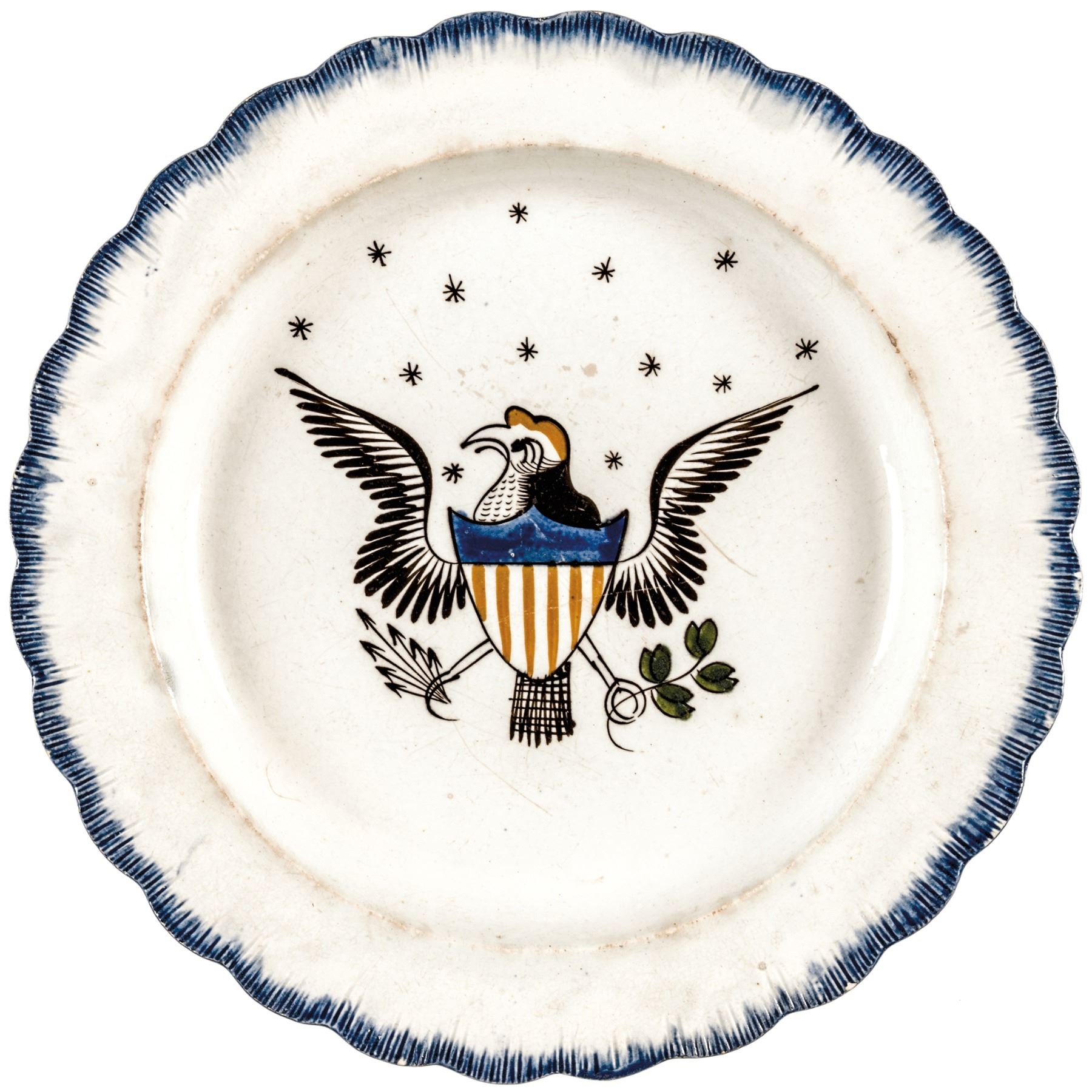 c. 1830 Patriotic Design Heraldic American Eagle Feather-Edged Pearlware Plate, Leeds, England, Choice Very Fine.