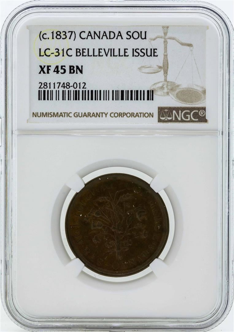 One c. 1837 Canada Un Sou LC-31C Belleville Issue Coin NGC XF45BN. NGC Certified.