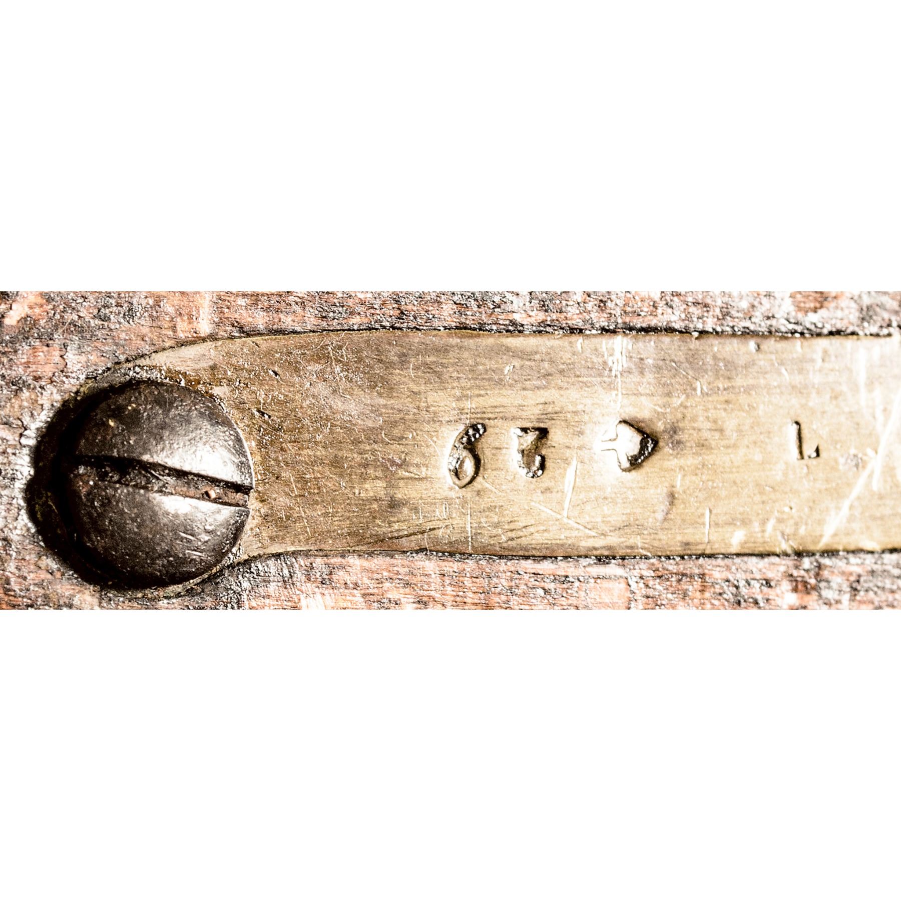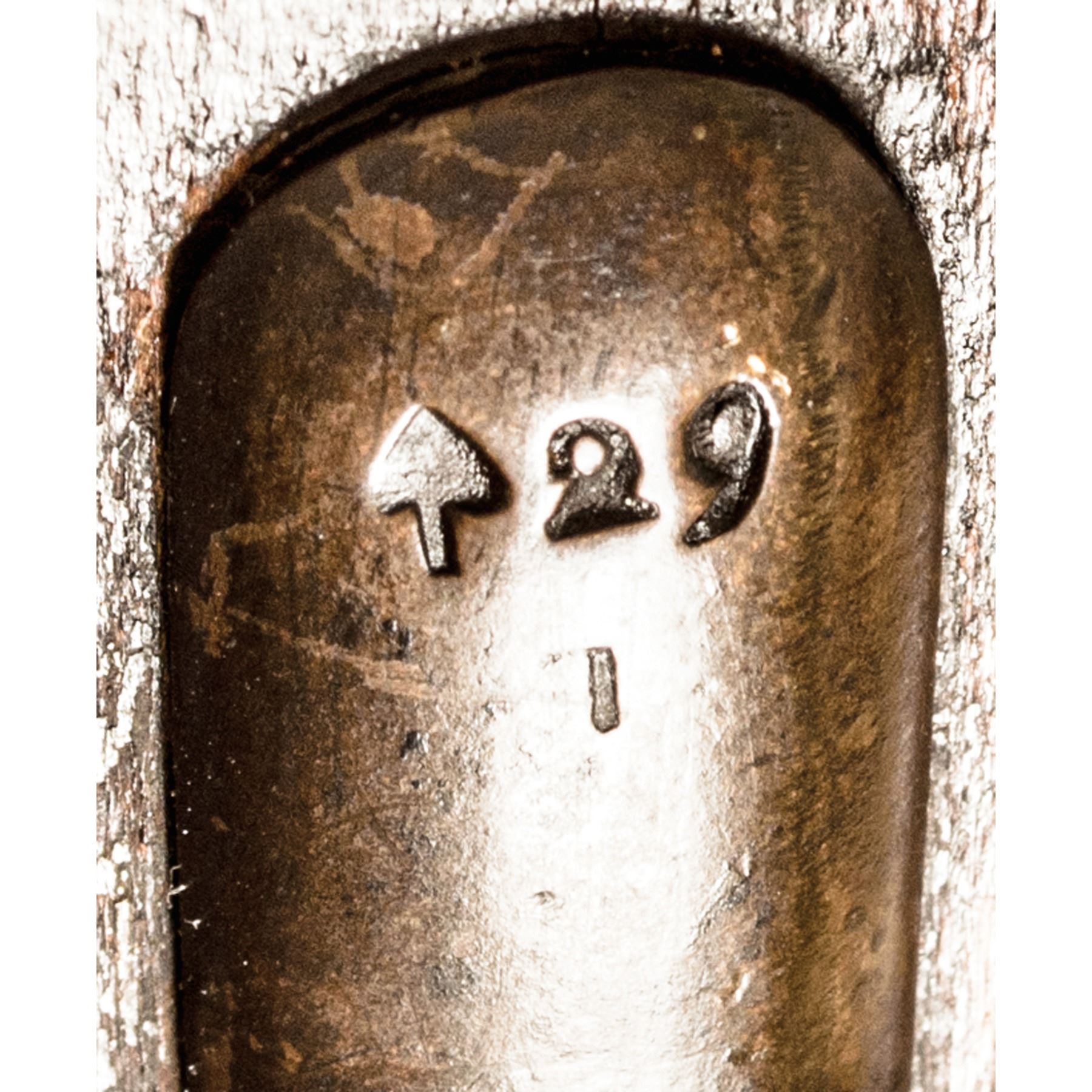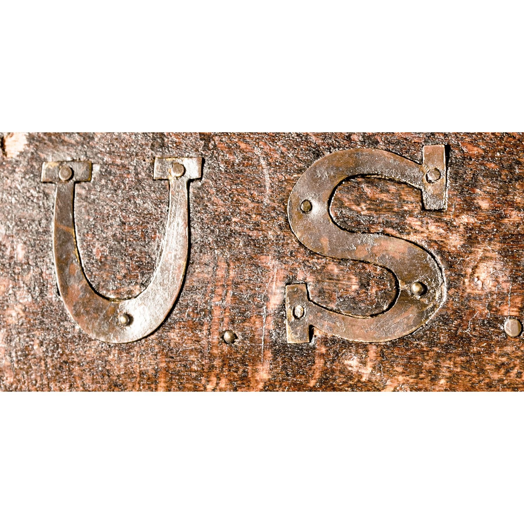 This Civil War Era imported Austrian Military Model 1849 Percussion Musket has a 33.25", .74 caliber smooth-bore octagon to round steel barrel with remnants of the maker's name stamped into the top of the breech area "FRED. FRUWIRTH", rear sight and front sight is the bayonet lug. Lock has the remnants of the date "185#". Single steel barrel band at the muzzle. Brass butt plate, trigger guard, and side plate. The stock is solid exhibiting heavy use with minor loses on both the right and left upper edges of the fore-end, scratches and dings from service. The right side of the butt stock has added brass letters inlaid forming "U. S.". A nice looking survivor.
