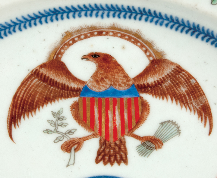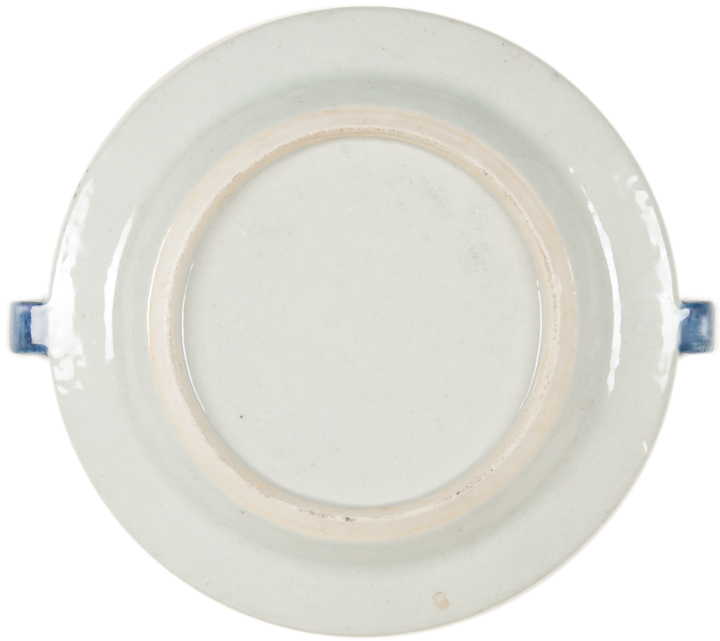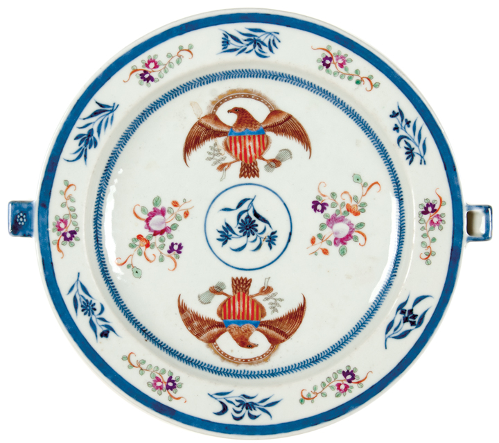 c. 1850 Chinese Import Warming Dish with Two American Heraldic Eagle Transfers, Choice Extremely Fine.