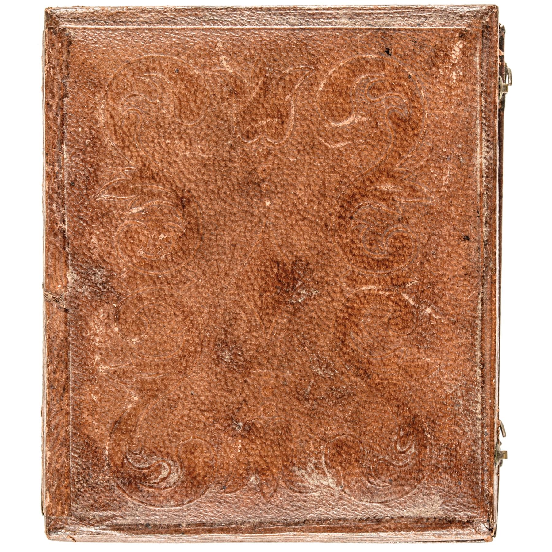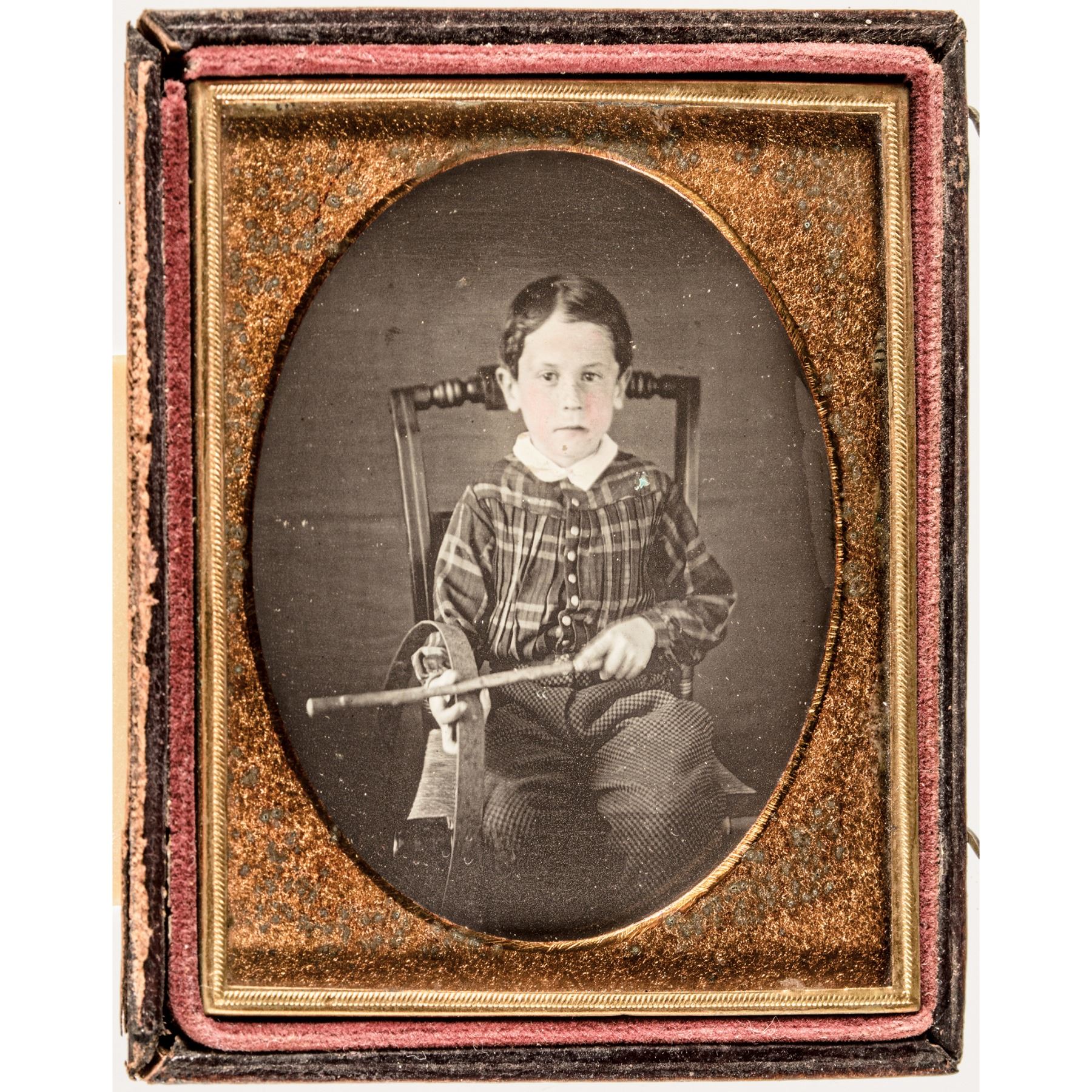 Hand-tinted Daguerreotype (Sixth Plate) of a young boy seated with a hoop and stick toy. Extremely desirable because of the unusual, toy subject, but even more so because the child has been identified as Ezra Lincoln Abbot (part of the Abbot family from Andover, MA) that traces their lineage to Abraham Lincoln. The boy pictured here is the son of Dr. Ezra Abbot’s first marriage to Harriet Abbot which lasted only five years, Ezra Lincoln Abbot. At first glance, it appears that young Ezra is holding a wooden pointer or a musical instrument of some sort, but closer examination reveals that he holds a metal “hoop” in his right hand. Basically, Ezra would roll the hoop along the ground using the wand to balance the hoop and keep it moving forward, all the while running alongside playing with his toy. As long as the hoop maintained speed, Ezra could control it easily because the gyroscopic action of the spinning hoop would keep it balanced. This was a popular toy among both rich and poor. The image itself is in excellent condition and is crisp and clear. The cover has separated from the case at the hinge. Accompanied by an old card with Ezra’s full name in manuscript. Dr. Ezra Abbot became a physician and resided in Canton, Massachusetts for over 35 years. There are very few architecturally significant houses from the early 1800s that have survived almost intact with respect to their adornment and features. One such example is the splendid house built for Dr. Ezra Abbot at 470 Washington Street. Even today, 182 years after it was built, this Italianate home exemplifies a style that is rarely seen in Canton. See: Canton Citizen: True tales from Canton’s Past: Dr. Abbot’s House, by George T. Comeau.Abbot’s first marriage to Harriet lasted only five years and they had one son named Ezra Lincoln Abbot.