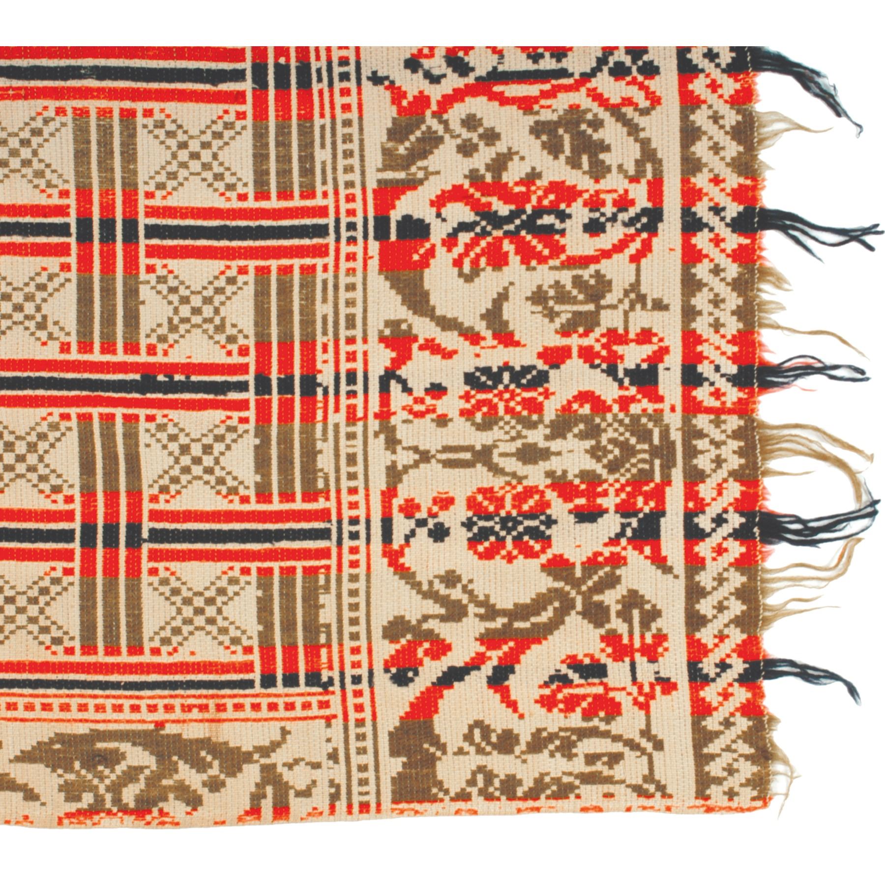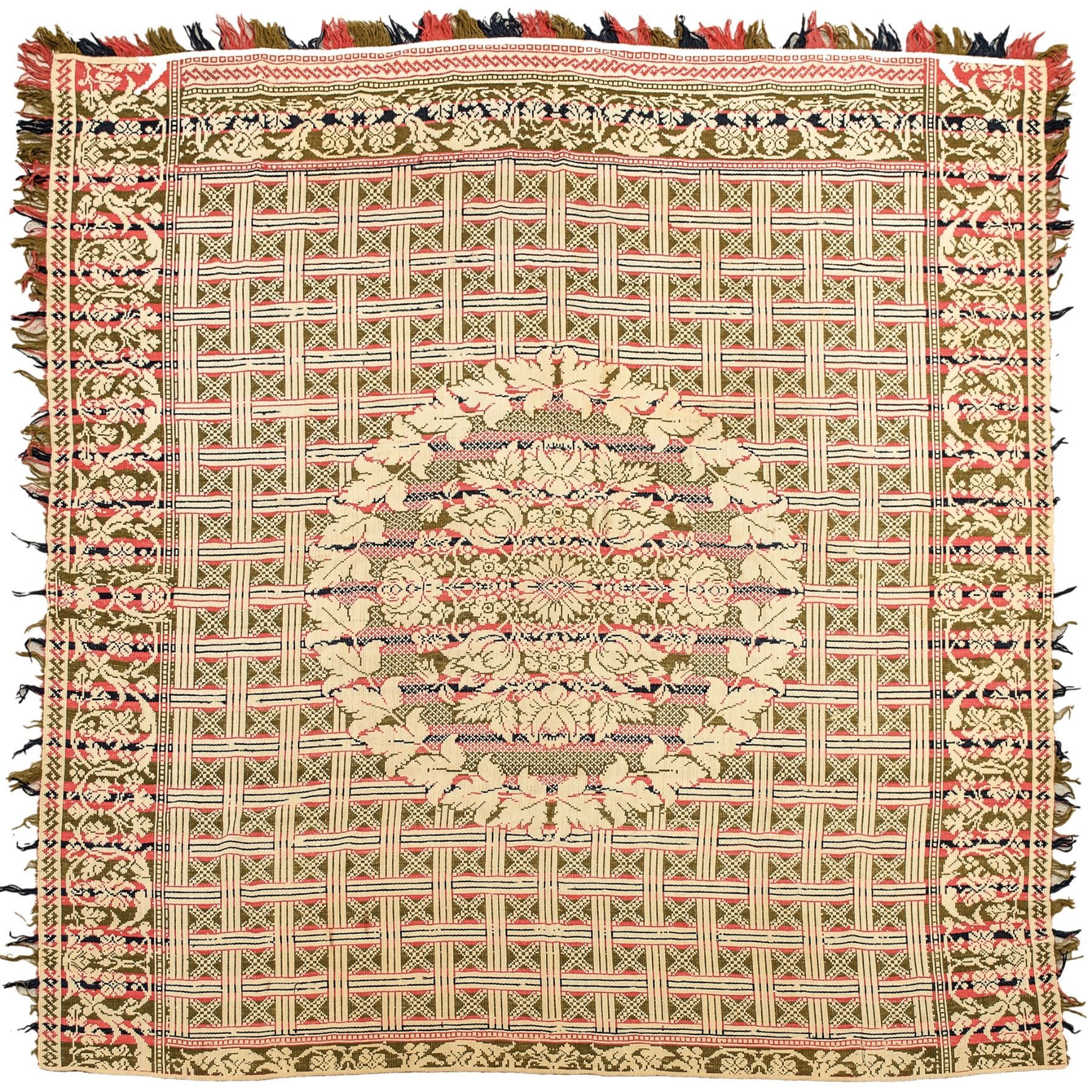 Beautiful 83” x 83” in size, with olive, red, and navy woven colored thread Jacquard Coverlet. The pattern depicts a large, central rose medallion surrounded by a blocked “X” motif which repeats to the perimeters of the Coverlet, with a vine and leaf floral border design which increases the symmetry and overall elegant eye appeal. Early American woven and useful “Folk Art" character, just a few minor spots, fringe intact yet sparse in places; otherwise lightly worn still in choice condition.