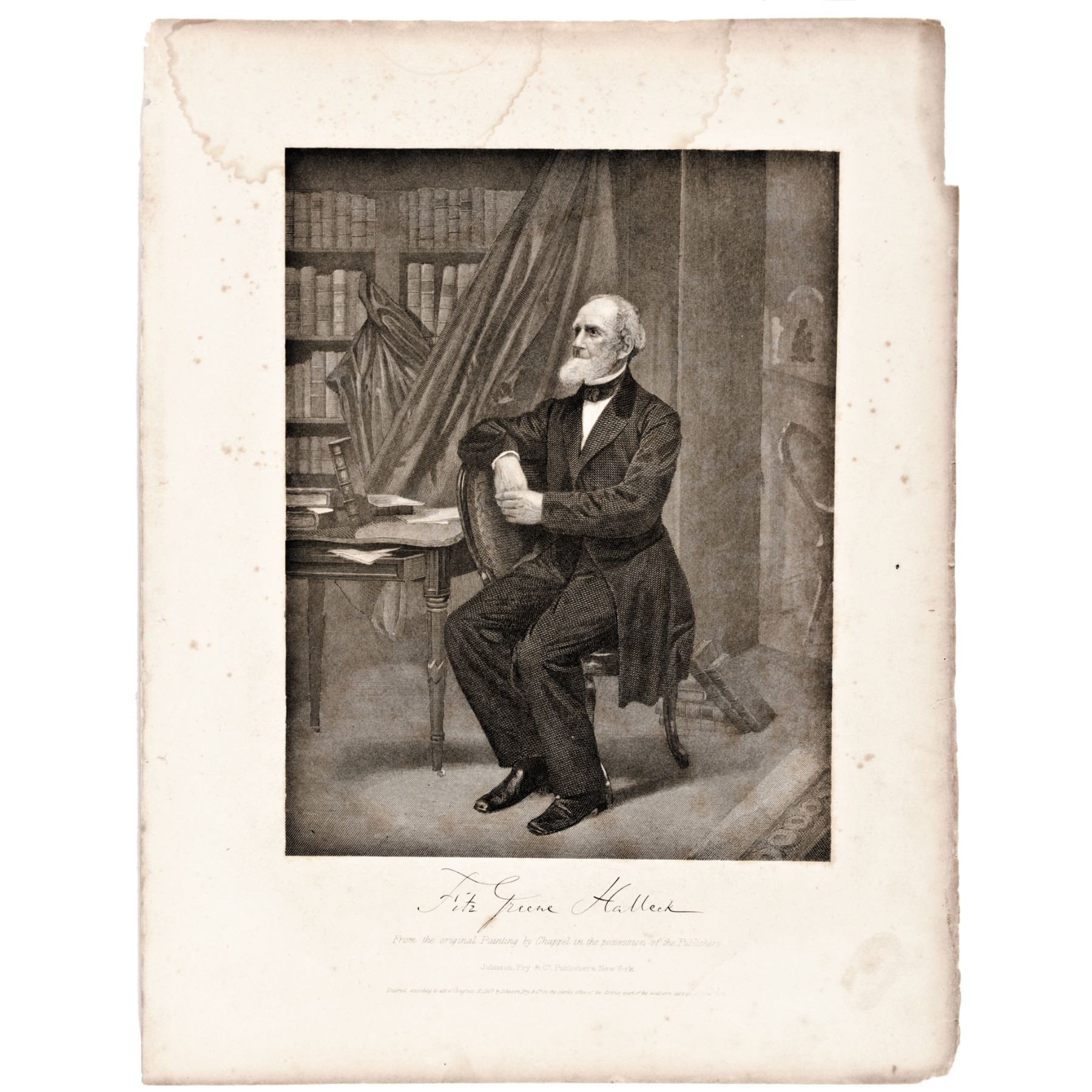 4. FITZ GREEN HALLECK, unsigned engraving from a painting by Chappel, published by Johnson, Fry & Company and dated 1867, nice condition, aside from a large damp stain at the top and some scattered light age toning.
