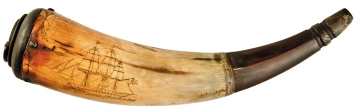 Two Hand-carved rings decorate on spout tip. There is no plug. The larger wooden endcap has a period metal “drawer-pull” attached, used to carry it or attach to a strap, with the original cap nails fully intact. There is some real age and actual light wear from use, a couple of faint natural surface cracks to horn and endcap. One fine hairline being carefully used in the selection of the location for the ferocious fish, as it looks like a long fisherman’s line with a bait at its end! The workmanship to create and decorate this unique Western Pacific theme Powderhorn is excellent. An impressive, highly desirable piece of Nautical American Folk Art.