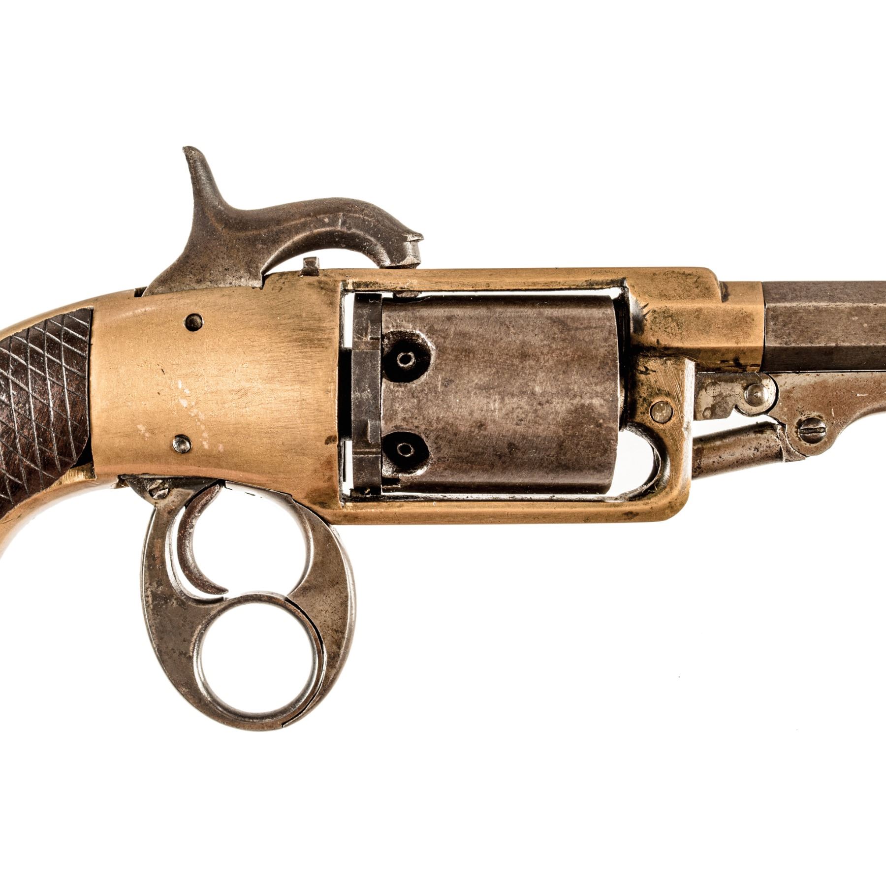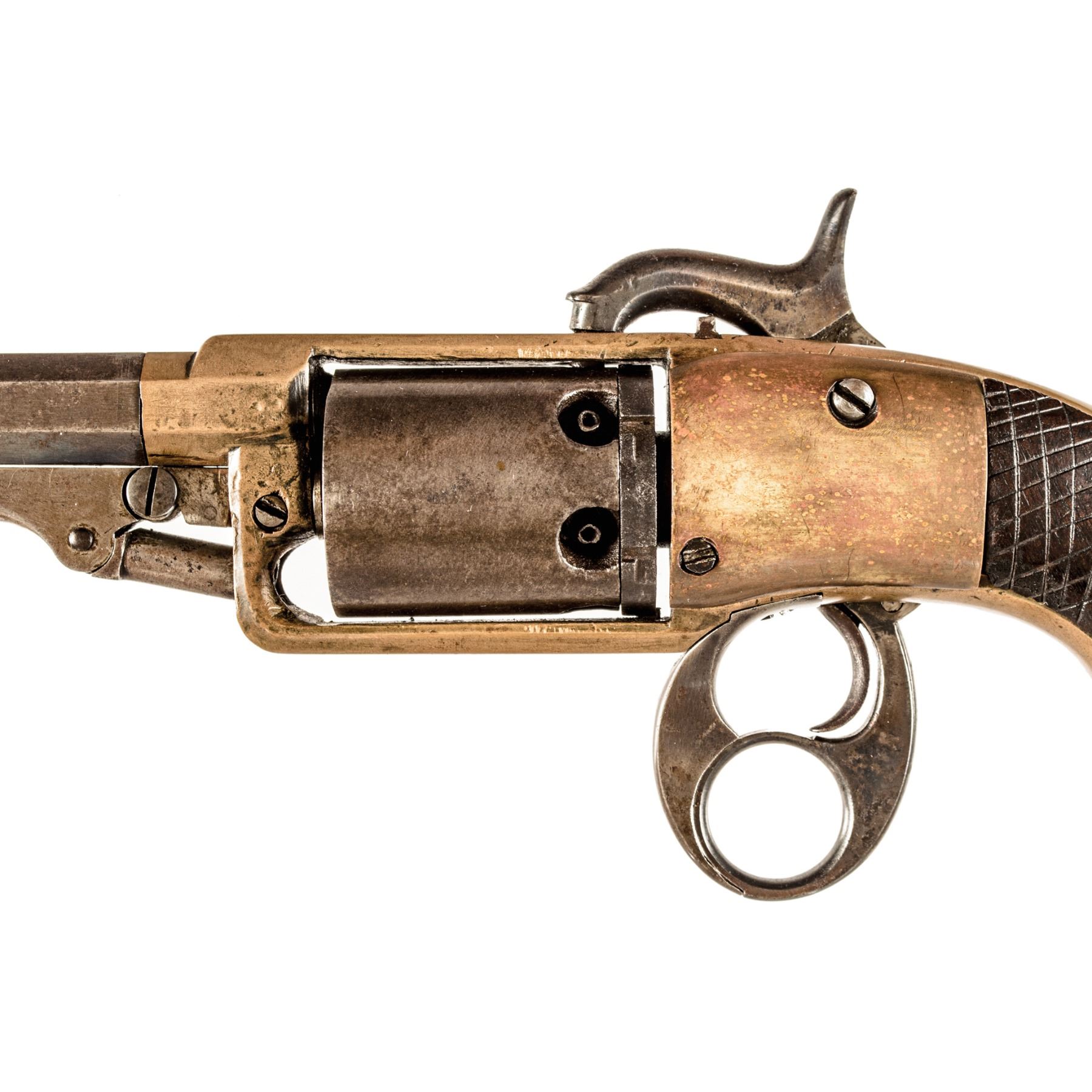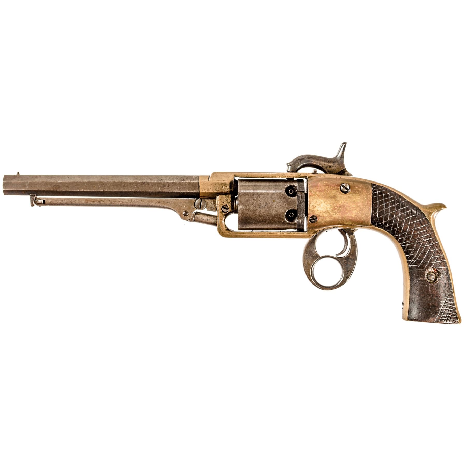 This is a very important Navy pistol as only 250 were made of this variation and only 100 Military pistols were produced to fill the U.S. Ordnance Department order. This pistol is number 72 of the 100. A very rare Civil War Period Military Contract Savage & North, "Figure 8", Navy Model Percussion Revolver. According to the FLAYDERMAN'S GUIDE, this Revolver is the second variation of the First Model. It has a unique round shaped brass frame being with an early type rammer assembly. It has a.36 caliber, 7" long octagon barrel marked on the top flat "E. SAVAGE. MIDDLETOWN, CT/H.S. NORTH. PATENTED. JUNE 17TH, 1856". Round steel 6-shot cylinder. Two-piece walnut grips with humpbacked profile that has been checkered and remnants of the military inspector cartouches are visible on both sides. The wood grip scales have some loses around the screw that secures them to the brass frame. All steel parts are smooth greyish-brown in color with about 30% original blue finish remaining (some areas more visible in protected areas). The brass has a rich yellow-olive natural patina. An exceptional pistol worthy of any Civil War museum collection.
